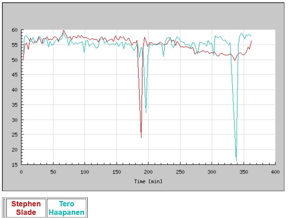 Yhdessä kuvassa ihmetellään Teron eturengasta. Vaikuttaa siltä, että MM-voitto kaatui rengasongelmiin! Tätä teoriaa tukee myös alla oleva, tuloslistasta otettu graafi: Terolla ihan lopussa toinen tauko - Slade jo ollut selvästi hiipumassa, mutta sai selvästi uutta virtaa kun tajusi Teron ongelmat. No, pitää odotella Teron omat kommentit, nämä vähän arvauksia.