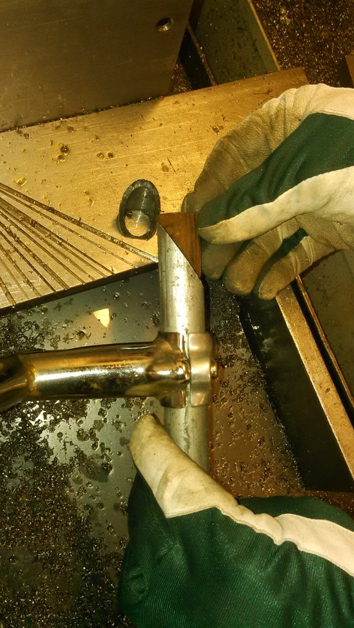 Tänään tehtiin klemmareita ja muita heloja. Kiilastemmi tehtiin tuumaisesta putkesta sahaamalla alapää vinosti poikki. Sahaan ei saanut vinompaa kulmaa kuin 45 astetta. Siksi piti käyttää stemmiä apukiinnityksenä, jotta saimme aikaan 35 asteen kulman, jollainen siis kiilastemmissä on.