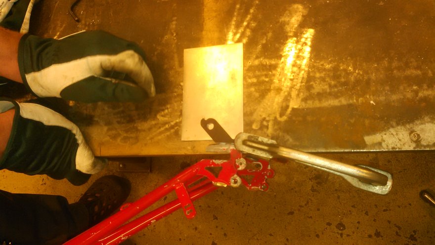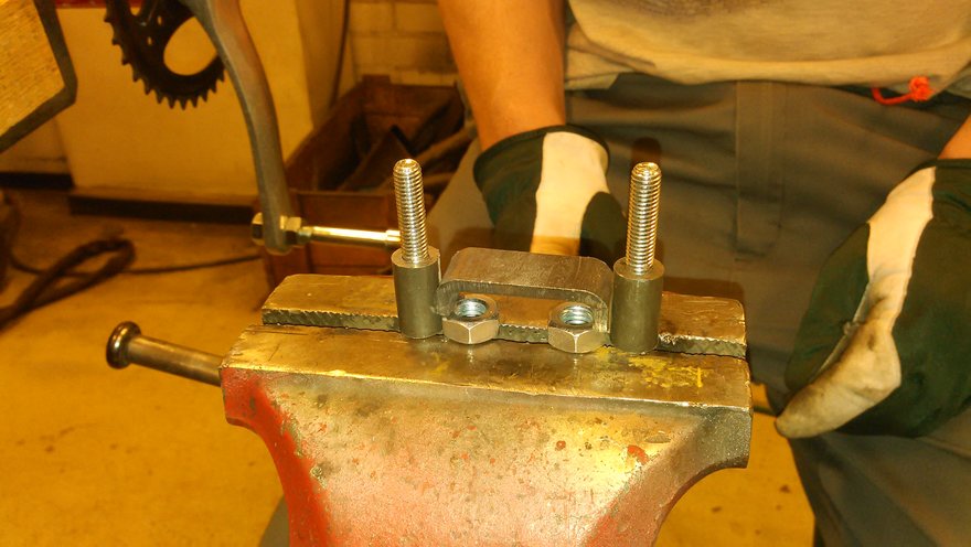 Toiseen päähän laitettiin holkinpätkä parilla ulkoputken kylkeen porattuihin reikiin hitsatuilla tulppahitseillä putken sisälle. Tuo on siis holkki , jonka yläpintaan kiilaa kiristävän pultin kanta tukeutuu. Holkki on 10 mm putken sisällä, jotta yhdysputki ei paina pultinkantaa, vaan istuu tukevasti putken istutuksessa. Pultti tehtiin M8 kierretangosta, jonka päähän hitsattiin mutteri.