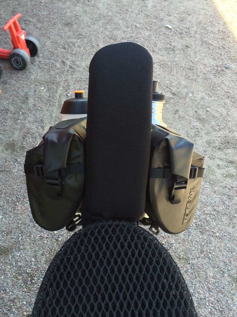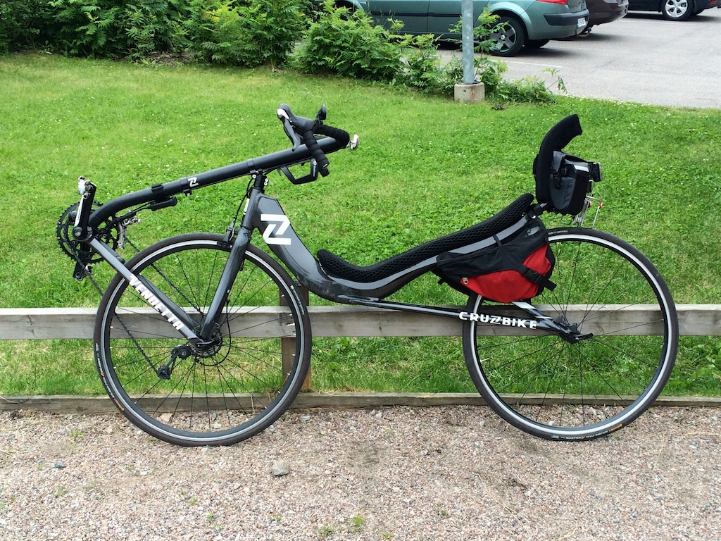 Niskan takana on Cruzbike foorumilta löydetty idea. Siellä paikka kahdelle pullotelineelle (Cruzbike Headrest Cage Mount Kit), siihen ja niskatuen putkeen kiinnitetty molemmin puolin vedenpitävät ns. satulalaukut. Pullotelineiden välissä vielä takavalo. Aika hienosti sai paljon kamaa ilmanvastuksen kannalta hyvin laitettua. Ja vielä on takarenkaan etupuolella kolmio tyhjänä, siihen sopiva laukku hakusessa, samasta satulalaukusta isoin malli saattais sopia.