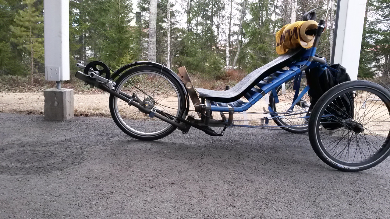 Ukrainan penkki ja 2x2" rimanpätkä mallaa runkoputkea. Tuosta ei voi polkimia viedä eteenpäin kuin 2-3cm. Tiukkaa tekee tulla istuinkorkeudella. Tietenkin 95mm kammet auttas asiaan ![]()