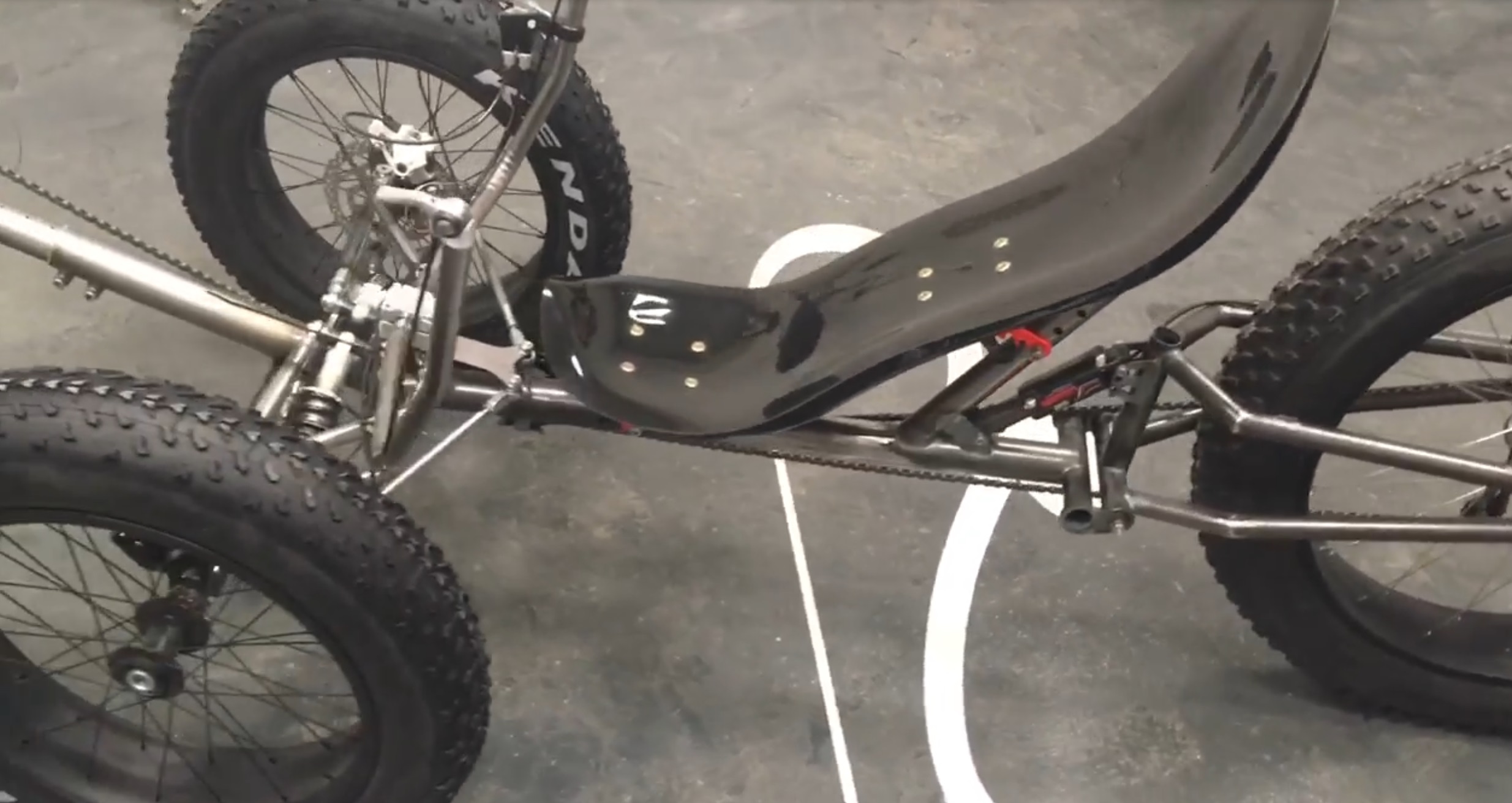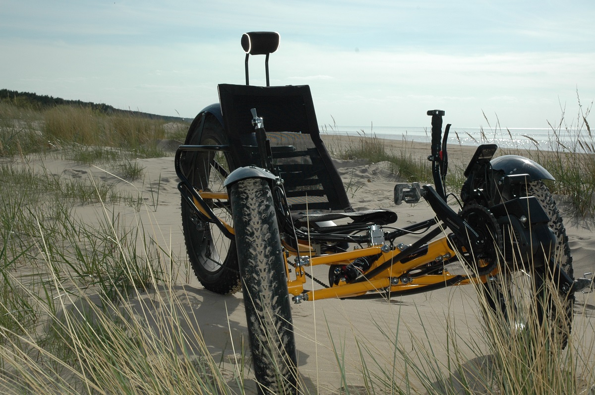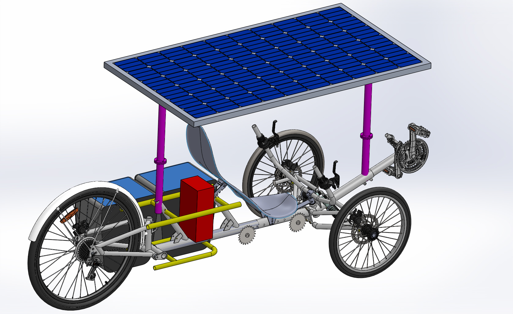 standard trike with a long base, wide front track, special frame to posting larger bags on the side, battery placement and solar panel brackets