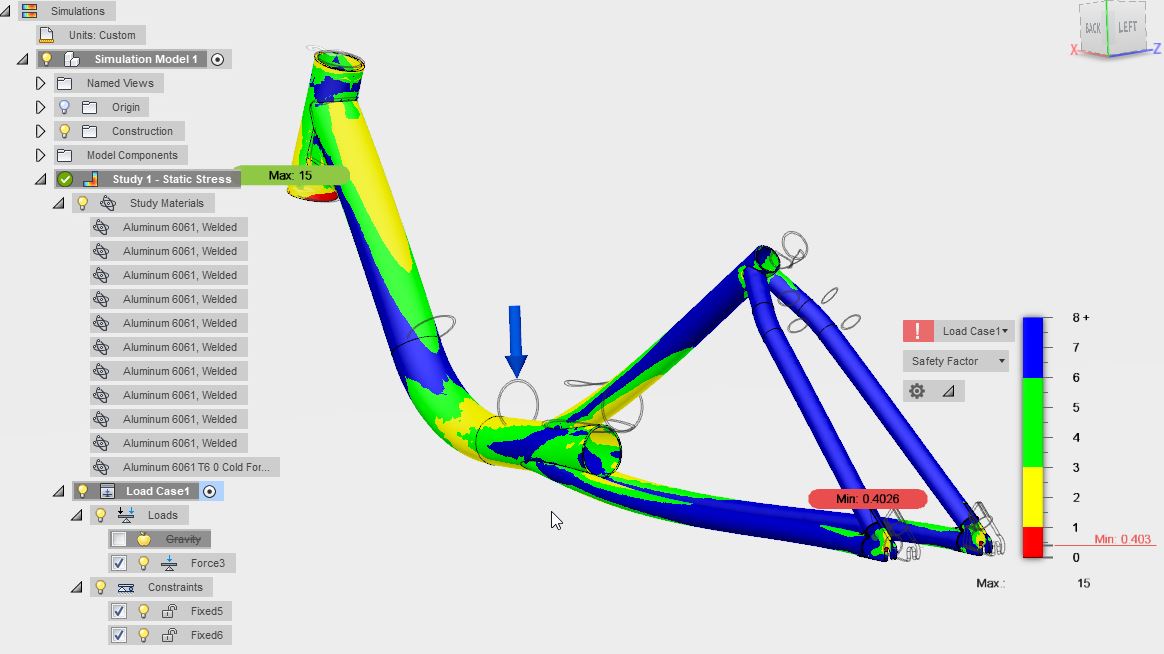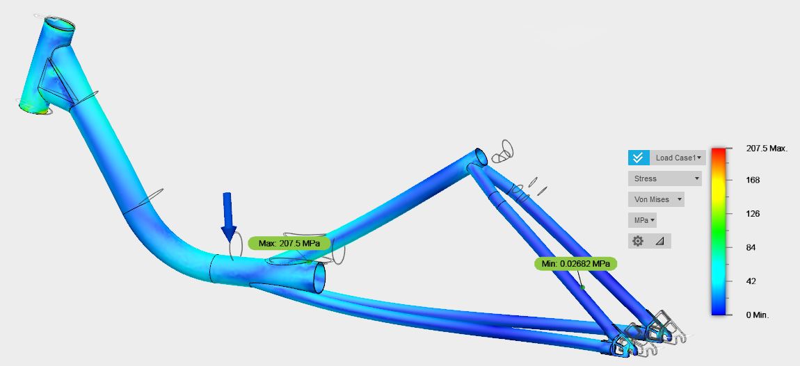 Mistä tuo malli on kiinnitetty. Minusta näyttää, että se on kiinnitetty jäykästi emäputken päistä. Jos näin on, ei tuolla kuormitusjakaumalla ole juurikaan yhteyttä todellisen käytön kuormitukseen. Todellisuudessahan pyörän runko on vaakaliikkeen sallivalla nivelellä kiinnitetty etuakseliin etuhaarukan kautta, jolloin kuormitustilanne on aivan erilainen tähän kuvaan verrattuna.