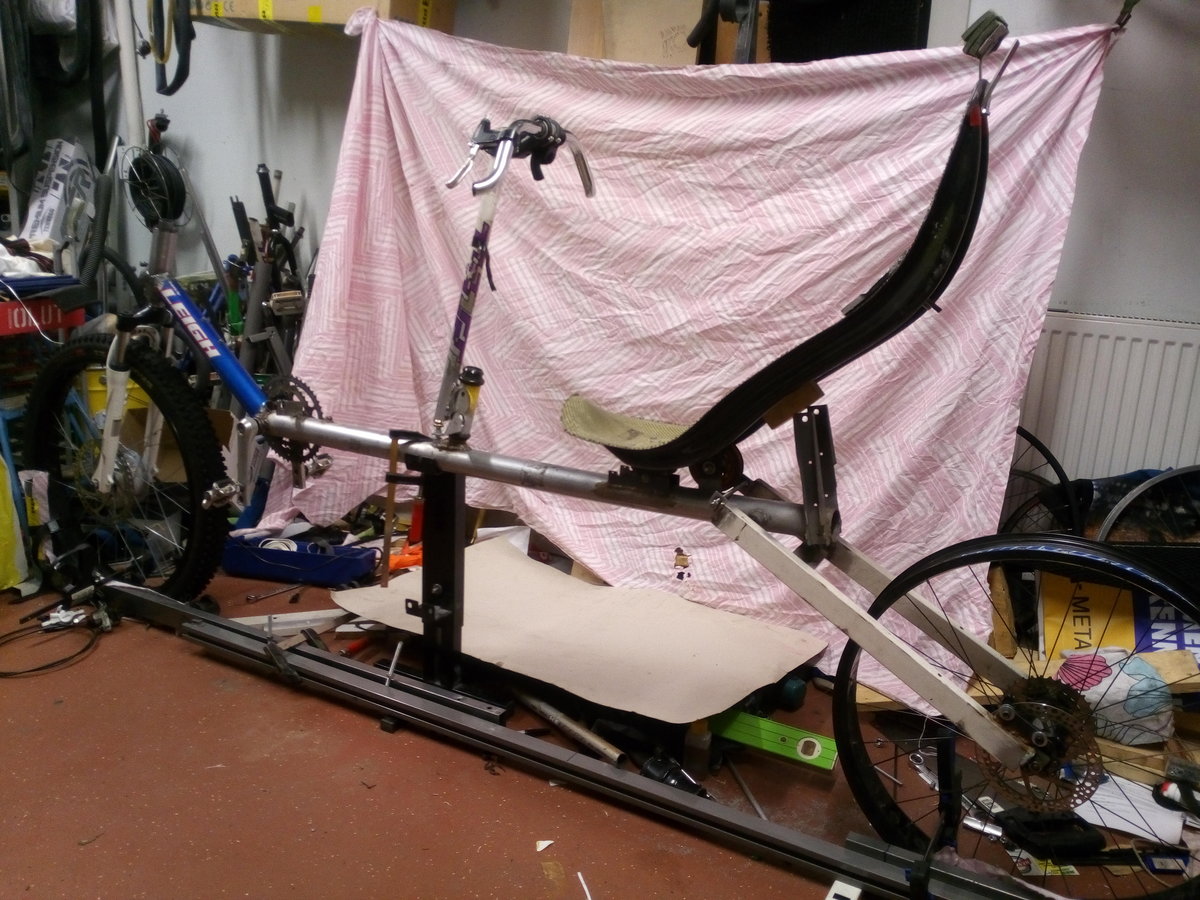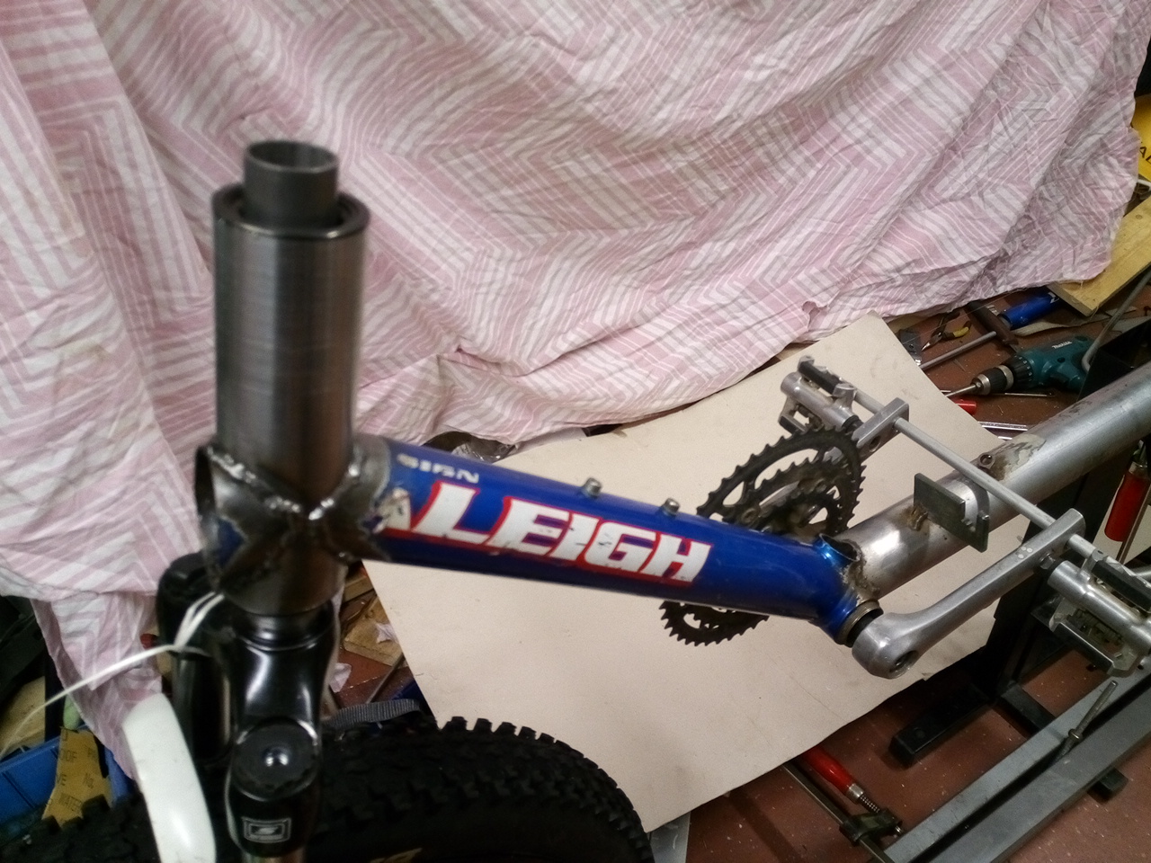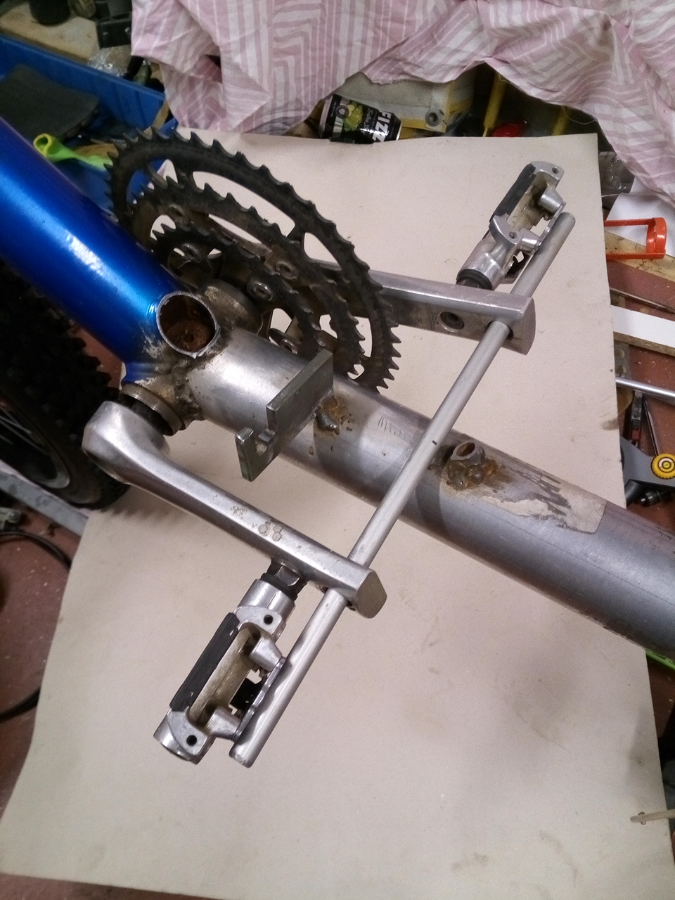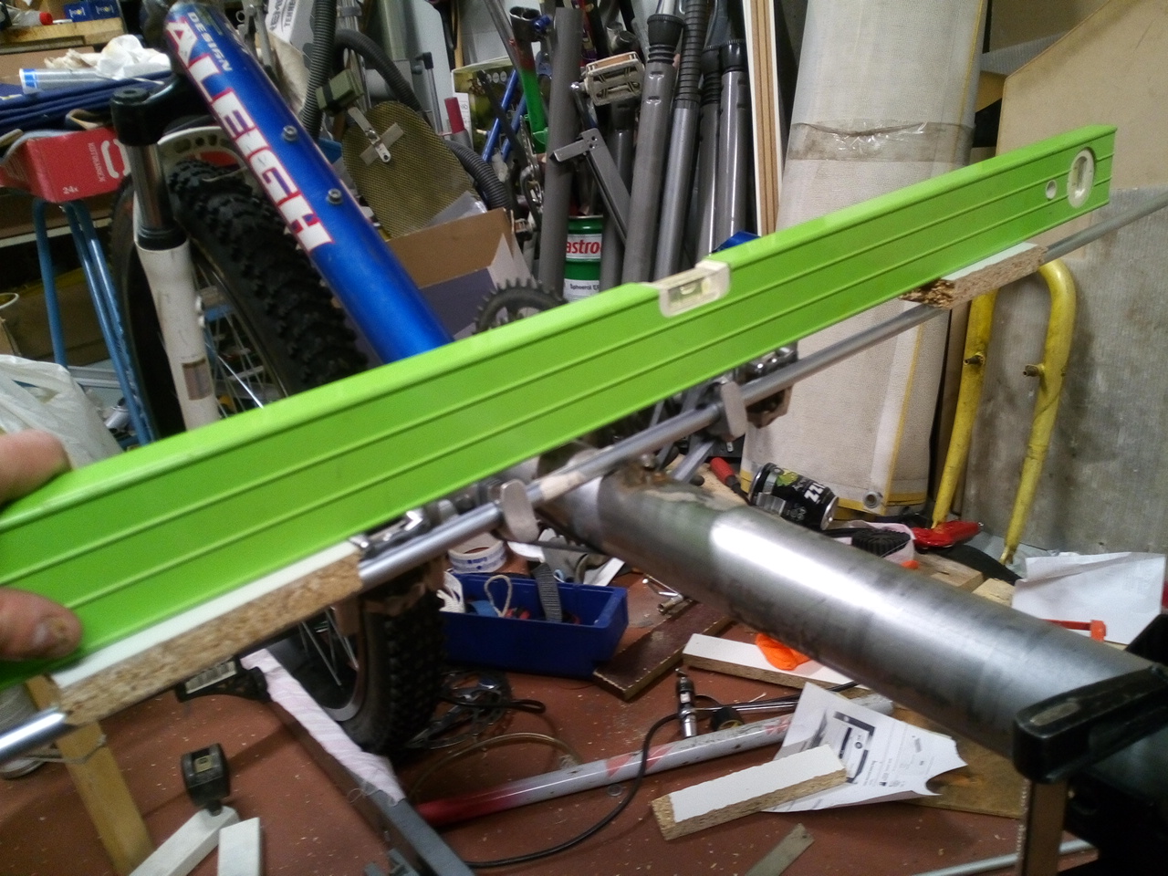 samuel kirjoitti:Nonni, tässä selkeyttävä kuvanto. Eli poikkitangon päällä oli vatupassi että polkimet olis vaaterissa, ja etuvanne oli passitettu pystyyn. Poljinkeskiö oli jo hitsattuna, emäputken hitsaus meni tosiaan uusiksi kun oli jigi päässyt löystymään.
