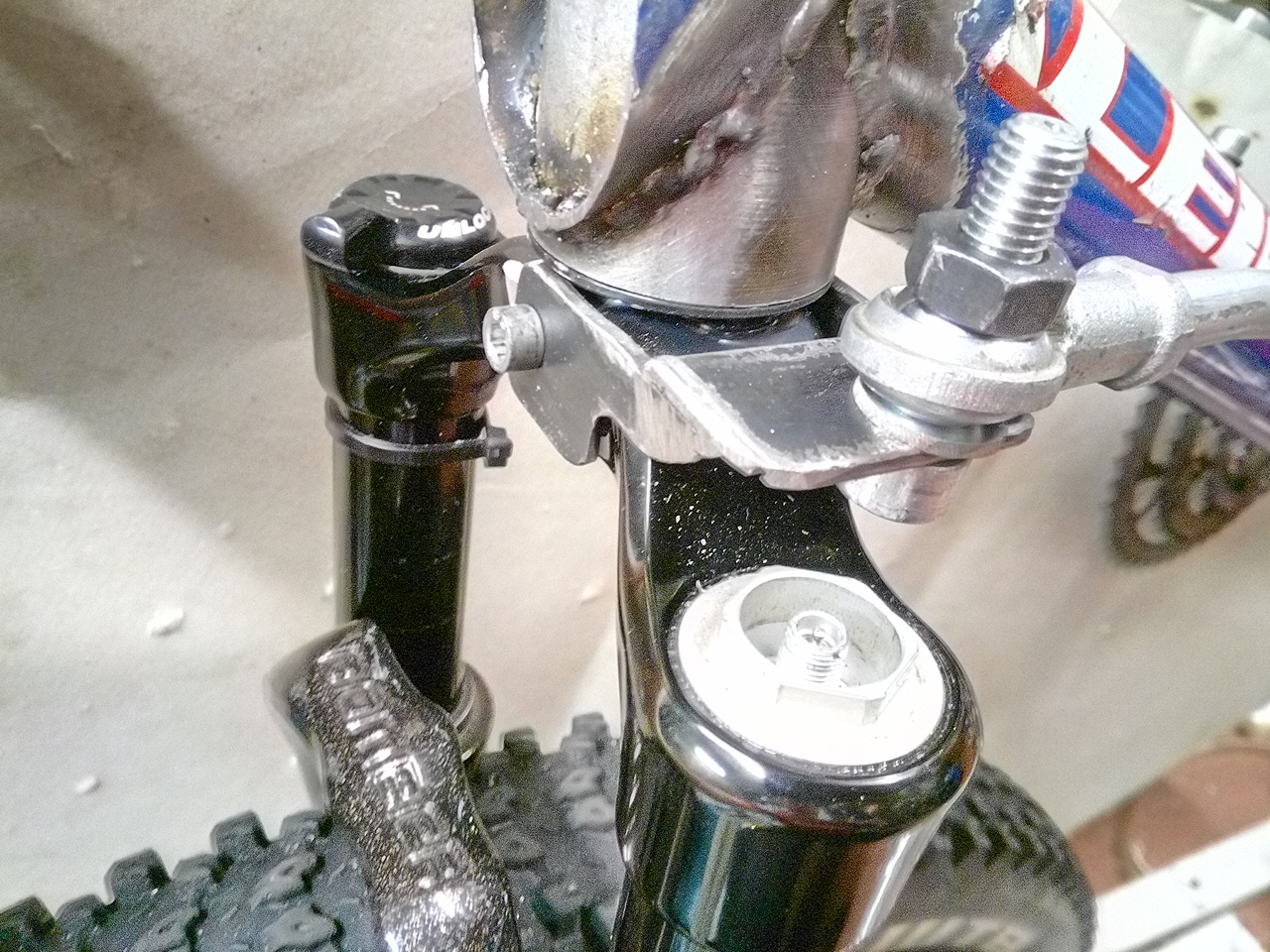 Tuli ilmakeula 100mm joustolla. Aluksi tämä jäi pois kun ei saanut etäohjausta tuohon korkkiin niinkuin ekassa keulassa. Sitte hokasin tuon lokarin kiinnitysreiän ja latasta muokaten kiinnike siihen. Lisäksi tätä haarukkaa puoltaa valmis levyjarrun korvake.