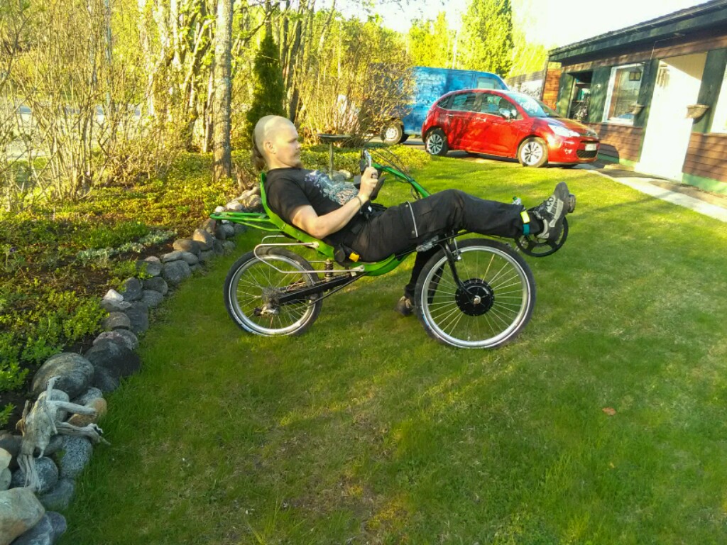 Tuohon on sähköjä rakenneltu ja etukiekko on 24", haarukka oli asennettu väärin päin, että rengas ei nappaa kiinni kampiin mikä oli ajosta tehnyt kiikkerää... haarukan käänsin ja tarakan viritin ja pienen koeajon kävin tekemässä. Kivan tuntuinen peli ja matala, saapi olla oikeasti selällään :)