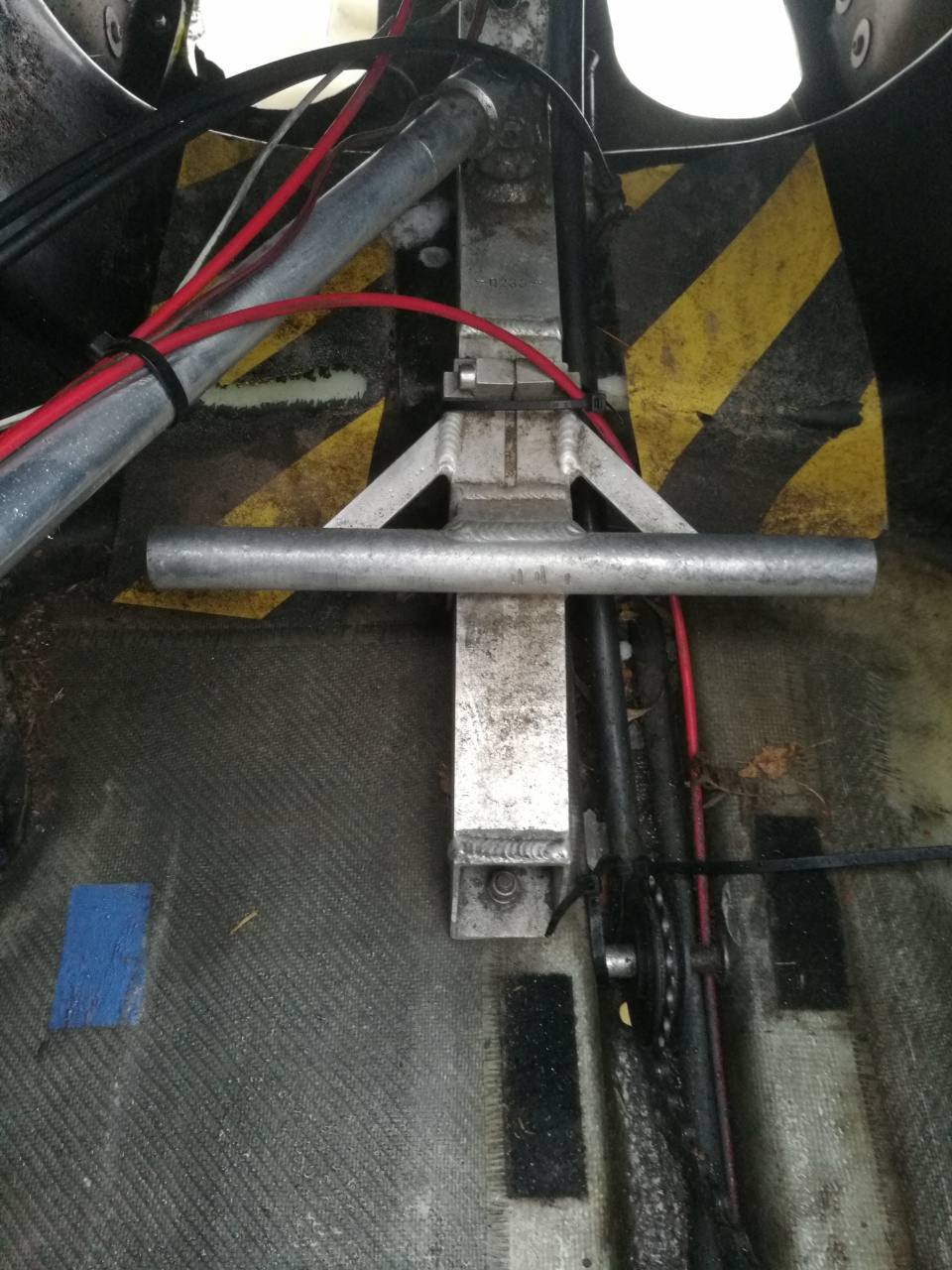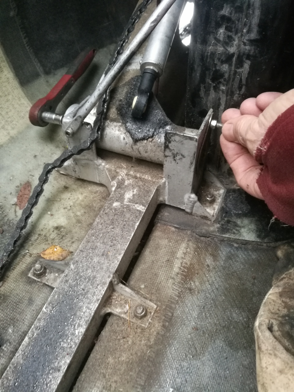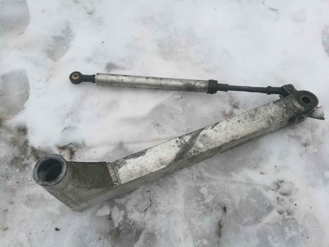 Teron neuvosta otin vaarin ja tutkimaan, kuinka tukivarsi irtoaa nivelestään. Toisessa päässä pidäkeruuvi, pitää peltikaulusta kiinni kuusiokoloruuvi/8mm mutteri. Toisessa päässä kuusiokoloruuvi ja eräänlainen prikka. Nämä irti ja vähän nivelen liikuttelua, ni akseliputki liikahti ja tuli vetämällä pois. Vielä irrotin tuon vinotuen ja tukivarsi mahtui irtoamaan, irtosi myös taka-akselista.