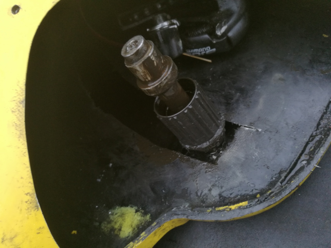 Oletan kiinnitysmutterista tuon akselin olevan samaa mallia kuin Velomobielin ohjeessa. Saukin videossa on akseli kiinnitetty kahden mutterin ja pultin sijaan yhdellä akselin läpiavattavalla pultilla sekä olakkeella. En löytänyt mainintaa ketjusta, niin kysyn että avasithan kiekon puolen lukituspultin ennen kuin käytit ulosvetäjää?