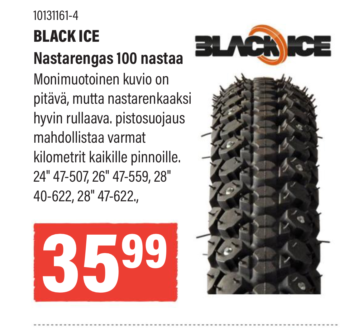 Noi black ice renkaat on päteviä. Meilläkin pääosa valikoimasta on niitä. Continentalin hinnat on noussu niin paljon et alkaa hirvittää.