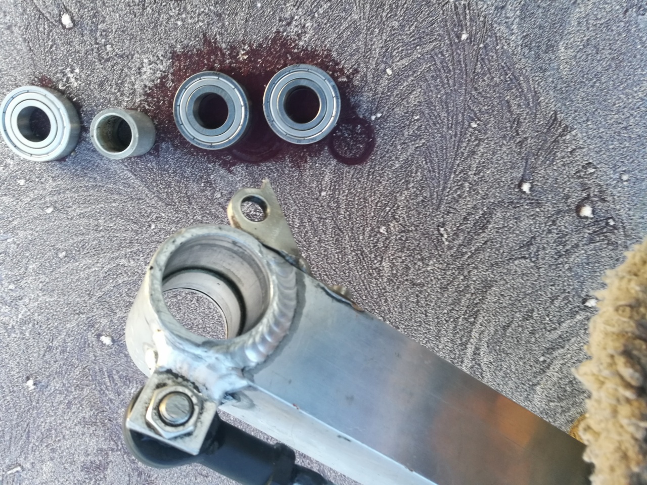 Osat tuli :) kuvassa akseli ja pakka, holkkeineen, prikkoineen ja pultteineen/muttereineen. Kolme laakeria tukivarteen. Pakasta pilkistää alumiiniholkki.