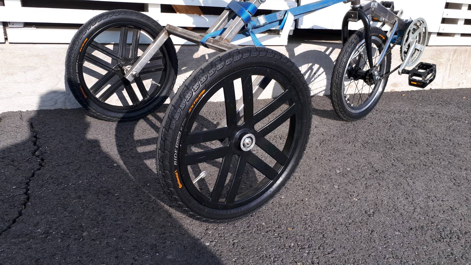 Dumbossa oli edessä karkeakuvioinen lastenpyörän kumi 2,5bar paineenkestolla ja takana pu-umpikumirenkaat.