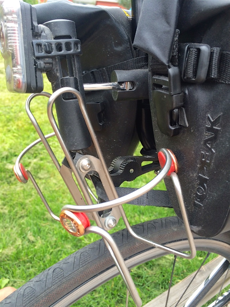 Niskatuessa laukut on niissä olevilla hihnoilla kiinni. Hihnat vaan ristiin niskatuen putken ympäri. Laukun alareunat keskenään yhdessä velcroilla, jotka myös laukussa valmiiksi. Alaspäin valumista minun asennuksessa estää lampun kiinnike joka on kiinni niskatuessa. Pullotelineillä ei oikeastaan ole roolia laukun asennuksessa muuten kuin ne nojaavat pullotelineitä vasten. Saakohan noista kuvista jotain tolkkua... (lisäselostusta kuvien yhteydessä).