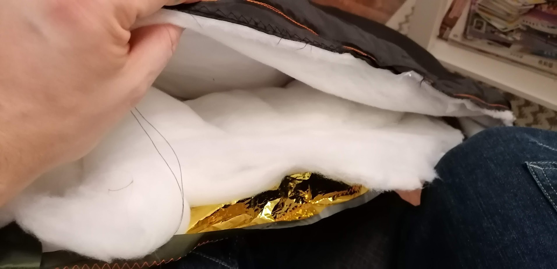 Pohjakankaassa on alumiinipinta. Lisäksi ompelin siihen kiinni avaruuslakanan lisäämään lämmön heijastumista. Pohjakangas on joka tapauksessa hengittämätön. Sitten tulee 167 g/ m2 Climashield Apex ja 75 g /m2 Climashield Apex. Pitäisi olla lämmin.
