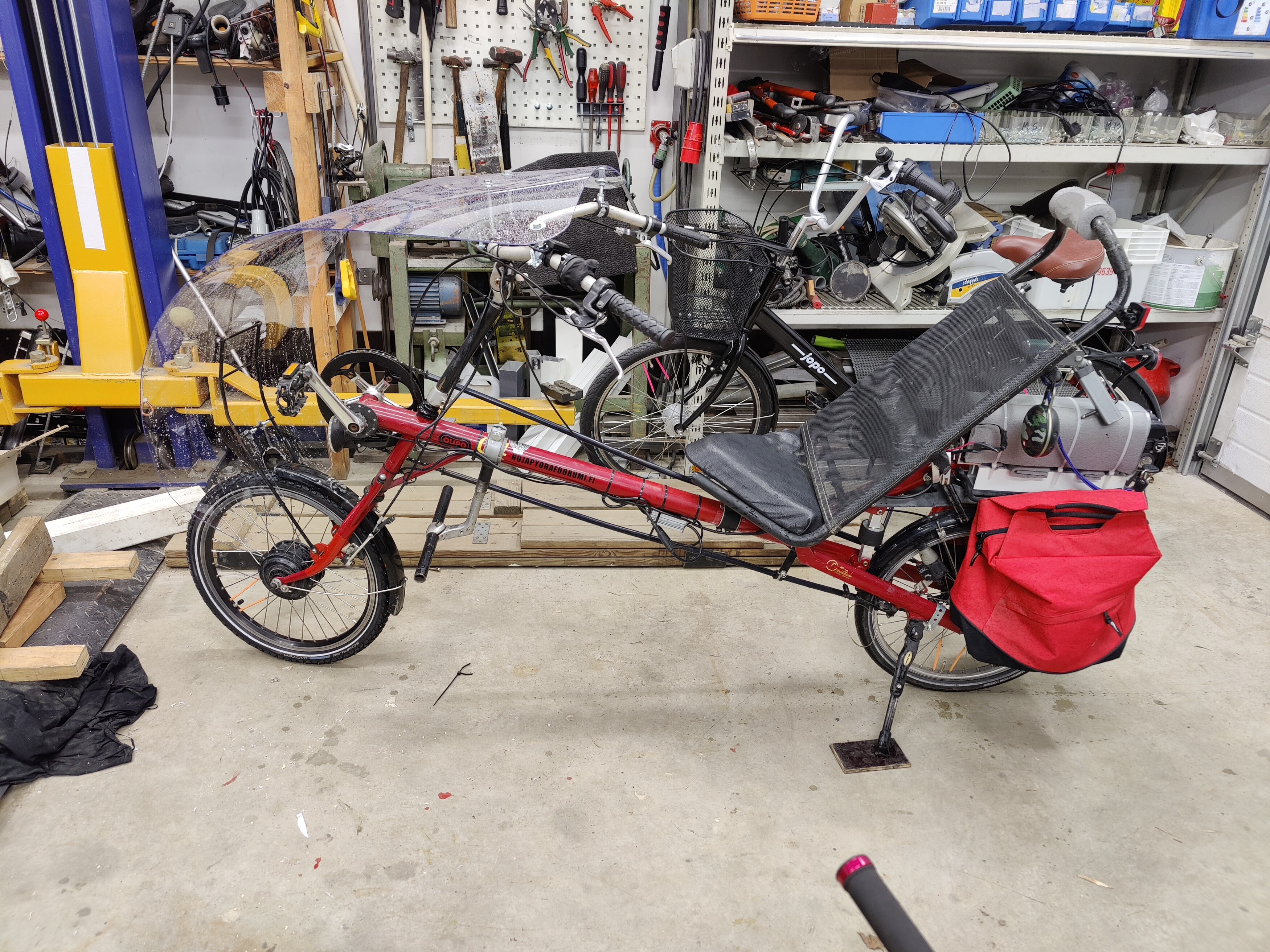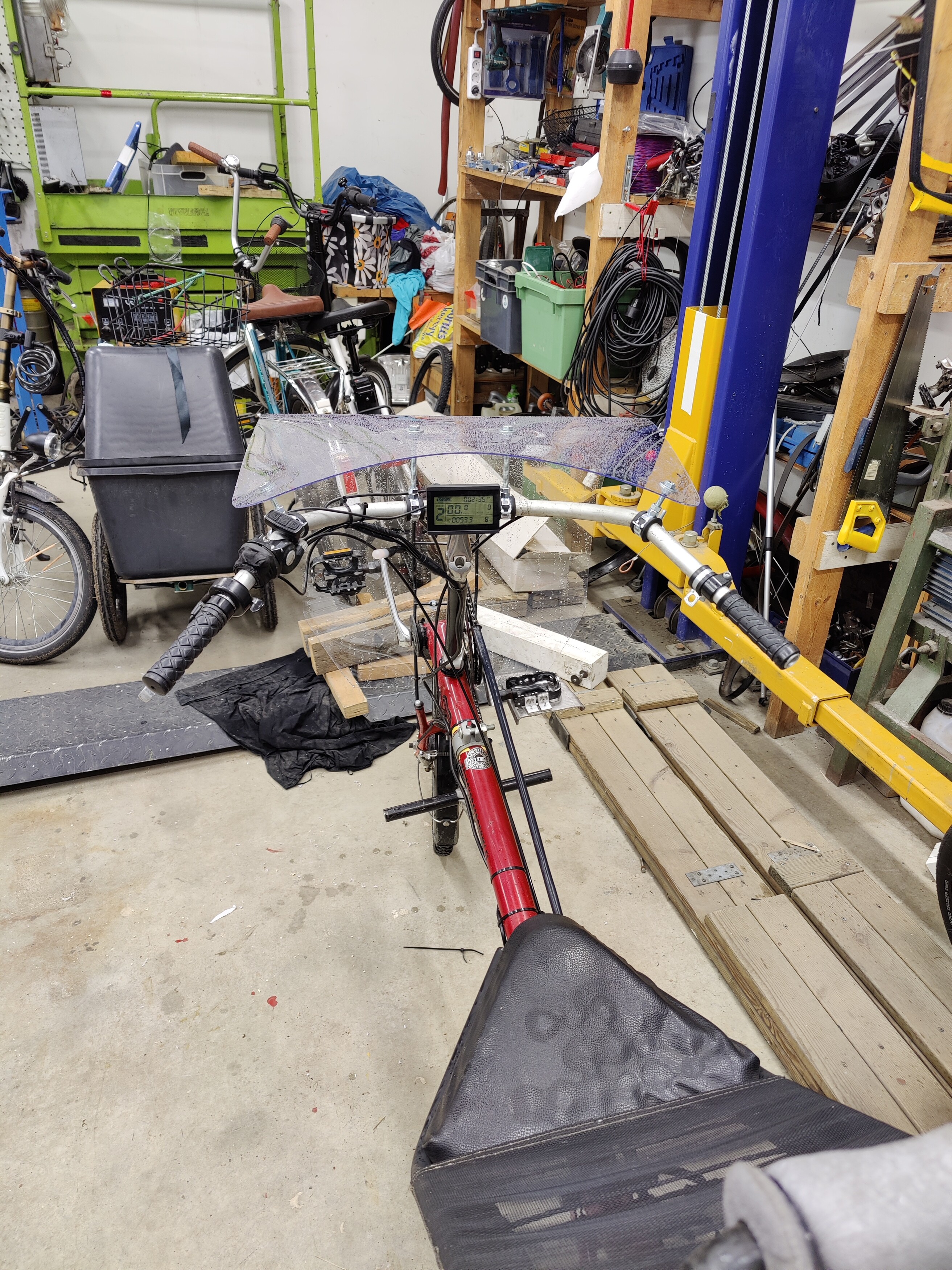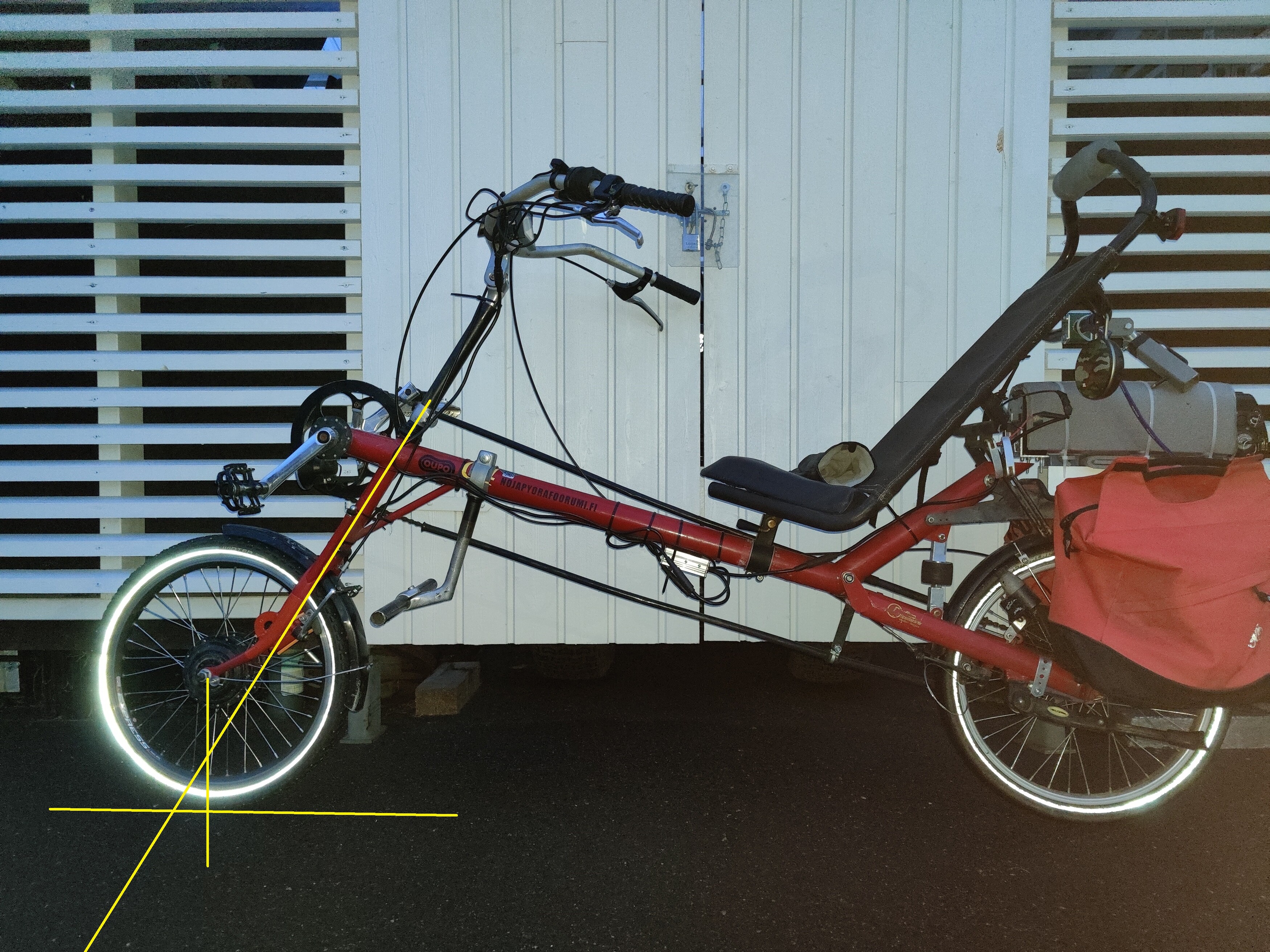 Oli kaikenlaista nippusiteiden laittoa, jarrupalojen säätöä ja kammistakin sahasin ylimääräpätkät pois. Sitten vasta pääsin koeajolle. Ihan kävelyvauhdissa hieman haukkailee, mutta vakaantuu heti 10km/h jälkeen. Mukava kun ei tarvitse enää aktiivisesti ohjata, vaan sievästi kääntyy kallistuksen suuntaan. Ei siinä taida ihan sataa milliä olla jättöä. Kammet on 135mm niin ehkä 65mm vois olla jätön määrä?