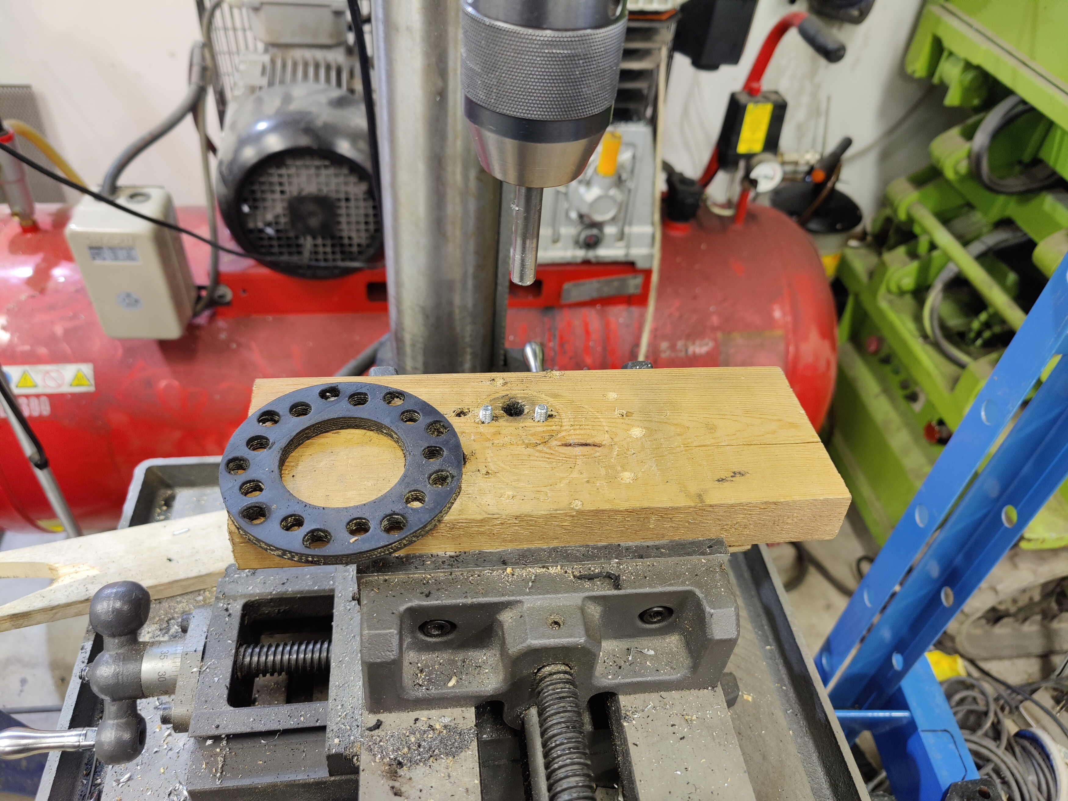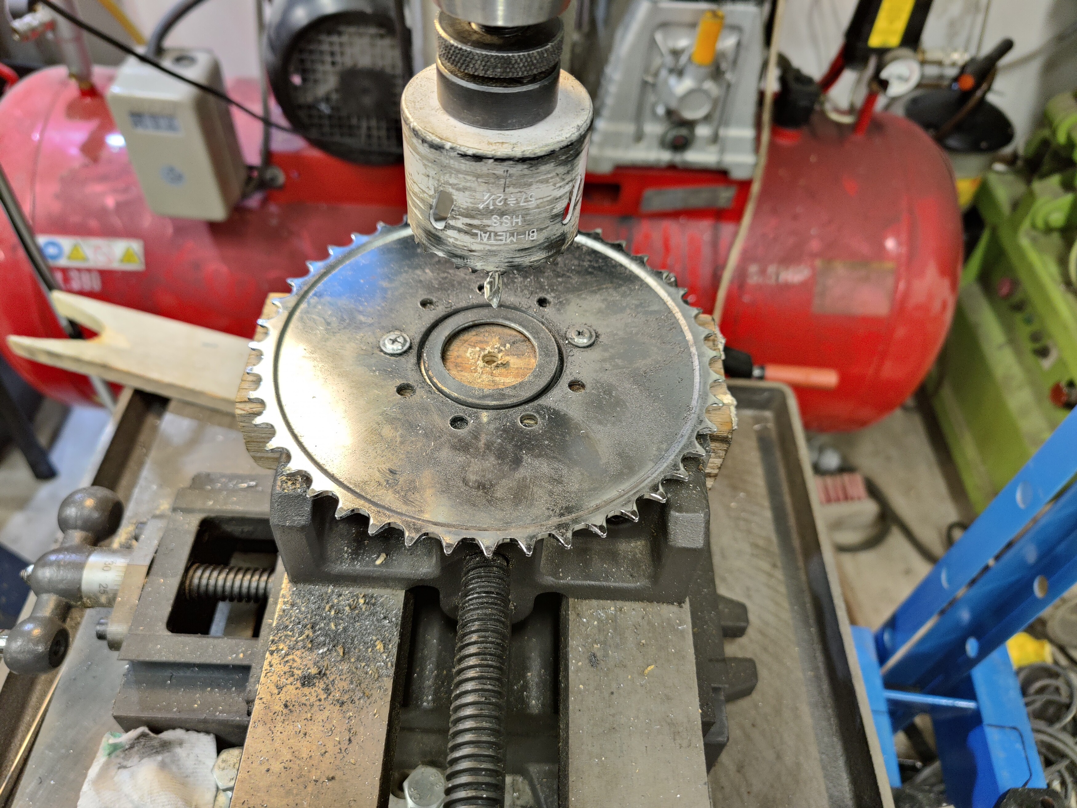 Hammasrattaan ja pinnojen välikumeihin tein sarjatyöjigin ja reijät porasin 8mm huonekaluputkella. Putki piti tyhjentää kolmen reijän välein.