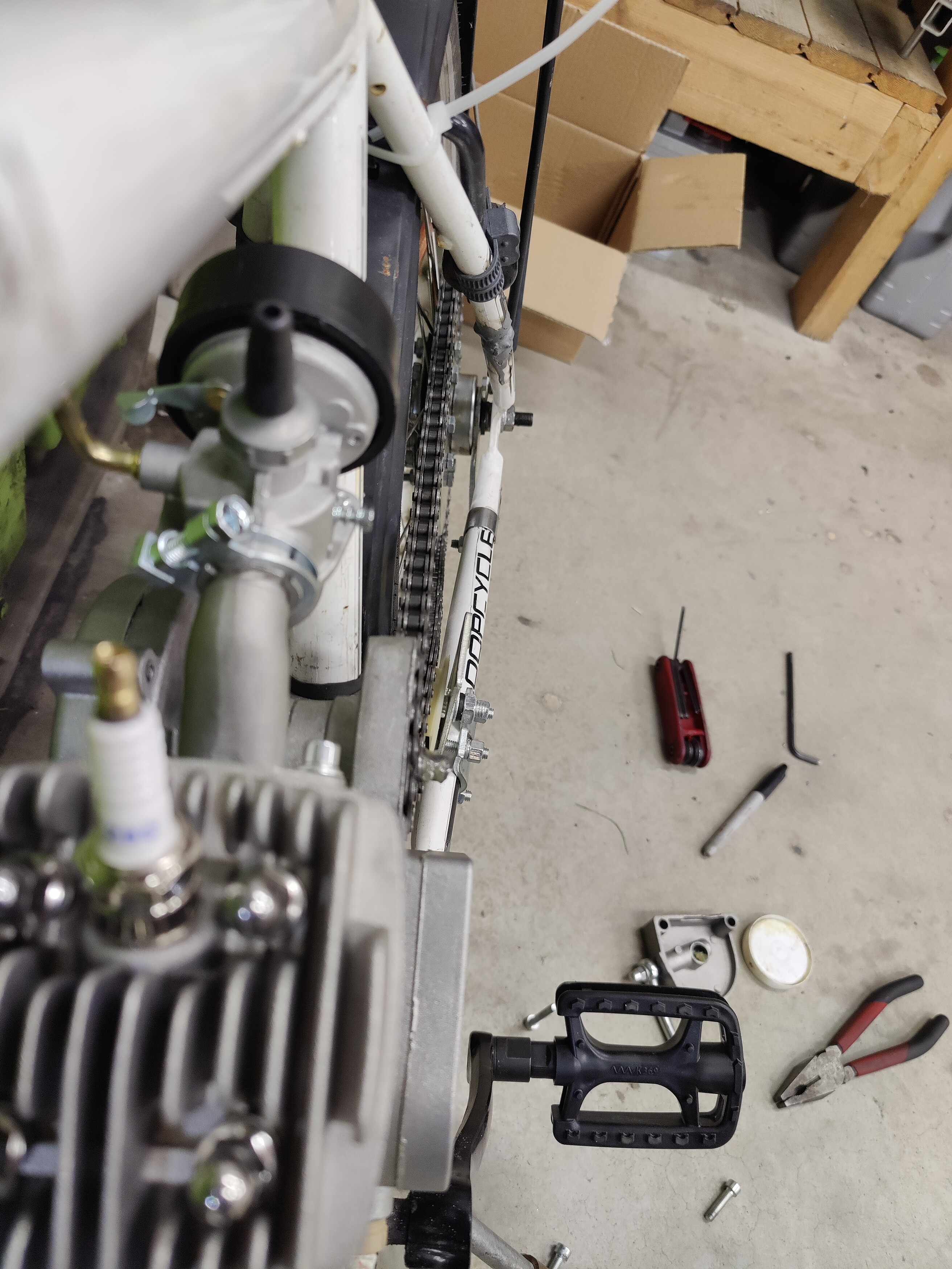 Moottorin ketjupyörän akselin läpi menee laakerikuula ja tappi, jota painaa kopassa oleva vipu. Edellisen viestin kuva.