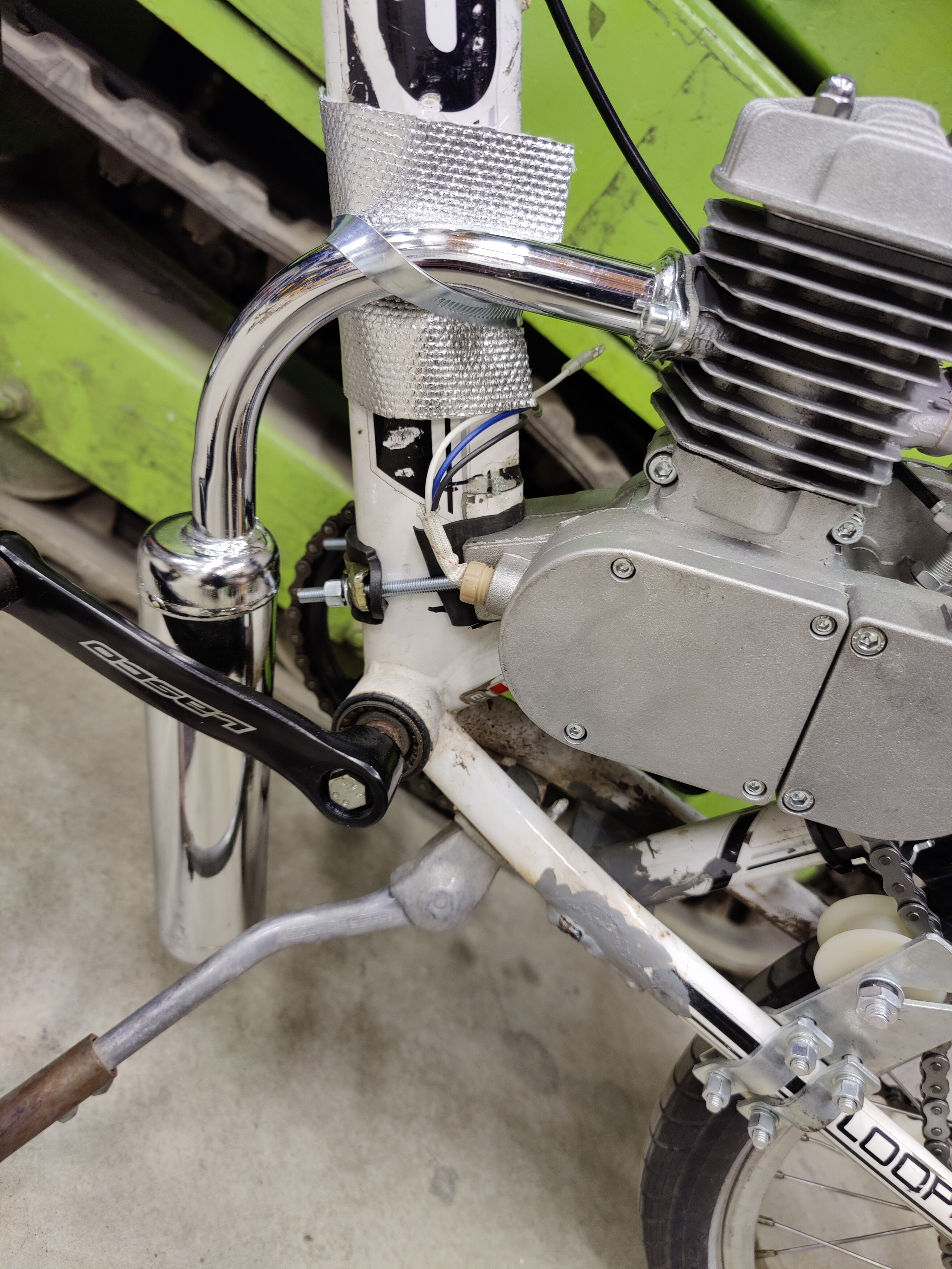Lämpösuoja pakoputken ja rungon väliin sekä iso klemmari puristamaan putken paikoilleen. Eipähän oo pelkkien M6 pulttien varassa.