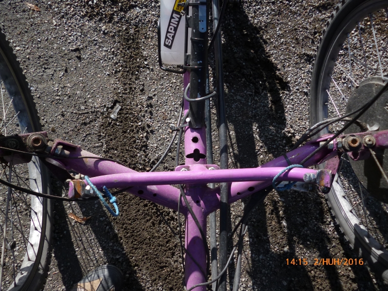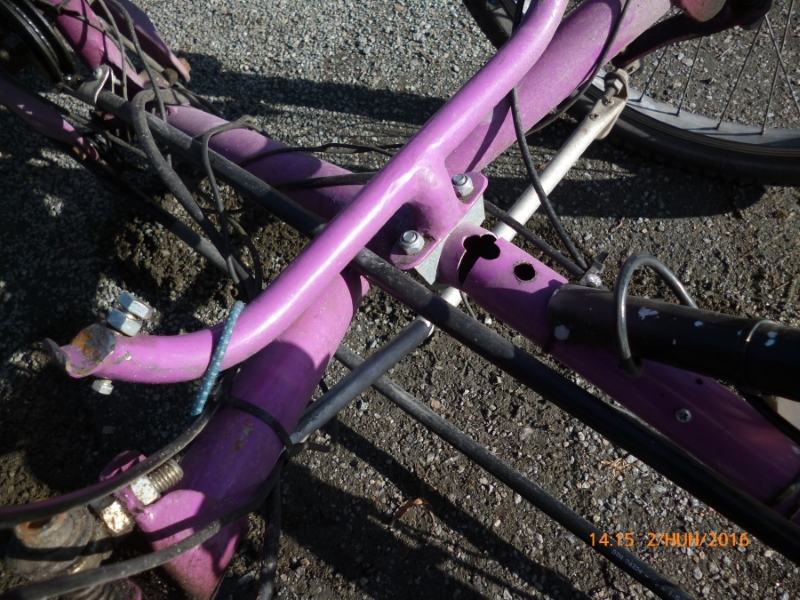 Minulle nyt kyllä hevosetkin nauraa kuten kuvassa oleva murtuma. Kävi nimittäin niin, että tänään Jyväskylää kiertävällä lenkillä rupesivat kummasti kantapäät yhä enemmän ottamaan maahan. Viimein pysähdyin ja rupesin tarkistamaan, mistähän kummasta asia johtui, ja ongelmahan pikaisesti löytyi. Heti olkavarsien liitoskohdan etupuolelle oli revennyt ammottava (naurava) aukko, joka oli runkoon läpiporatun 12 mm:n reiän kohdalla. Reiän olin tehnyt kahtia jaetun raidetangon vipuvartta varten, josta myöhemmin luovuin, kun tuli liikaa kläppiä, enkä ollut reikää hitsannut umpeen. Runko ja olkavarret ovat 42x1,5 mm:n ohutseinäputkea. Ehkä muuten kestäisivät, mutta ei tällaisia lävistyksiä. Ensi tiistaina täytyy vempain viedä kansalaisopistolle hitsattavaksi. Tuo toinenkin viereinen reikä täytyy hitsata umpeen.