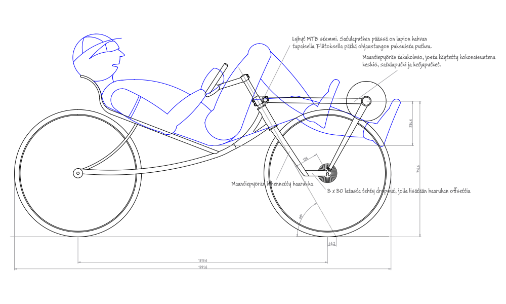 En tarkoita, että pitäisi tästä tehdä, mutta tuota kuvaasi katsoessani oivalsin, miksi franskit laittaa ohjauskulman niin vinoon. Mitä loivempi ohjauskulma, sitä kohtisuoremmin runko tulee emäputken kylkeen ja sitä alemmas ja lähemmäs rengasta saa takapuolen ja sitä paremmin riittävät lyhyemmätkin jalat etukiekon etupuolella kammille. Takapuolen saa alas ja eteen, mutta emäputki tulee syliin aggressiivisemmassa kulmassa. Rungon kuormitus myös vähenee sitä vähäisemmäksi, mitä vinompi ohjausakseli. Kuormitus siirtyy rungolta kääntyvälle etuosalle. Kyllä tuossa ranskalaisessa on pointtinsa. Samaan suuntaan konstruktiivista vaellusta jatkaen saa aikaan pythonin.