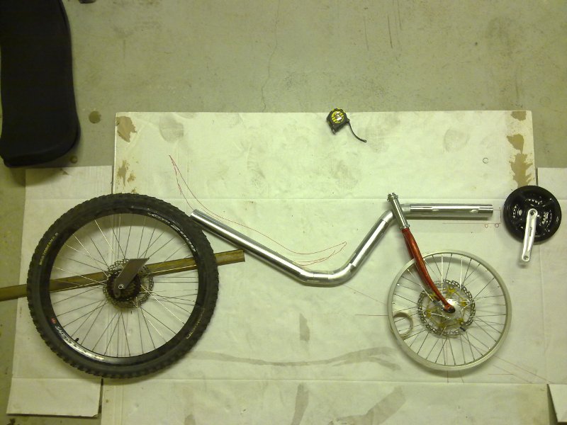 Mulla tulee pienoista värkkäystä jos vielä lyhennän runkoa... Tähän tulee 10mm runkoputkea paksummat renkaat, jotenka takahaarukan on oltava jonkin verran pitkä että rengas mahtuu suorien haarukkaputkien väliin. Tällä hetkellä akseliväli on 1170mm.
