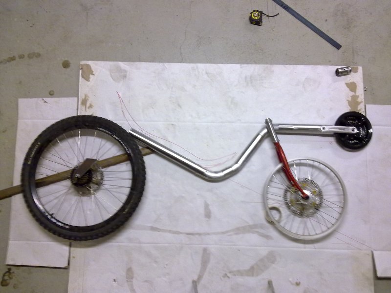 Työtoverin painostuksesta aloin siis rakentamaan tuommosta korkeaa low raceria, melkeinpä taitaa luokittua mid raceriksi. Tämä rakkine jos joskus valmistuu tulee korvaamaan Biltemasta ostetun kaikin puolin parannellun (vaihteet, jarrut(Hope Mono 6Ti), jousitus(tripletree keula ja paineilmajousi/öljyvaimennus takana) täysjoustomaasturin.