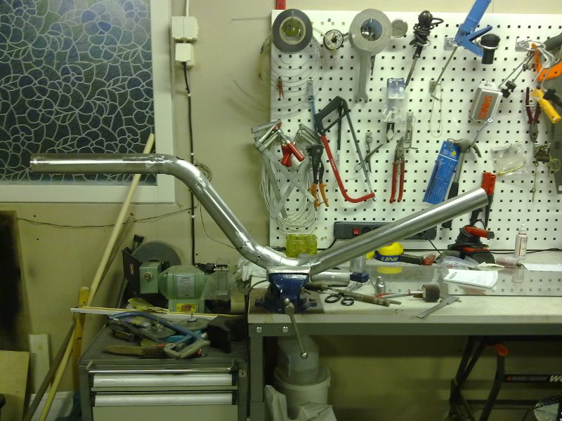 Käänsin tuon alamutkan toisinpäin äskettäin ja mun mielestä näyttää nyt paremmalta. Tuo takapään suora putki katkaistaan sitte ku takahaarukan oikea paikka löytyy...