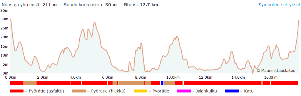 Ajoin tämän lenkin, 17.7 km, noin 65 minuutissa [korjaus: 54 minuutissa] rauhallisesti, polkien tasaiseen nopeuteen pyrkien siten, että ylämäessäkin vauhti säilyisi kohtuullisesti (ei sykemittaria mukana tällä kertaa).