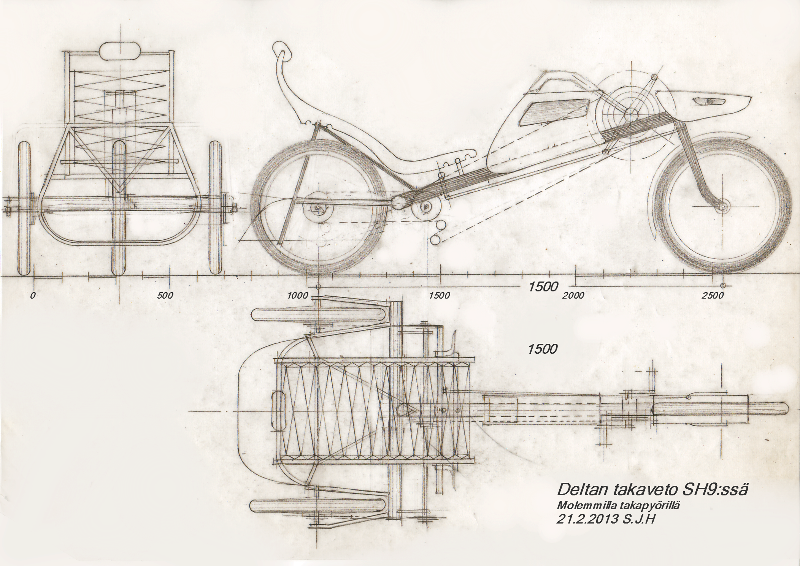 Olen tässä miettinyt toimisikohan deltassa molempien takapyörien veto kuvan mukaisella tavalla. Molemmilla puolilla olisi normaalilla vapaarattaalla toimiva yksirattainen takakiekko jolloin tasauspyörästöä ei tarvittais. Kaarteessa sisäpuolinen kiekko vetäisi ja ulkopuolinen olisi vapaalla. Suoraan mentäessä molemmat vetäisivät.