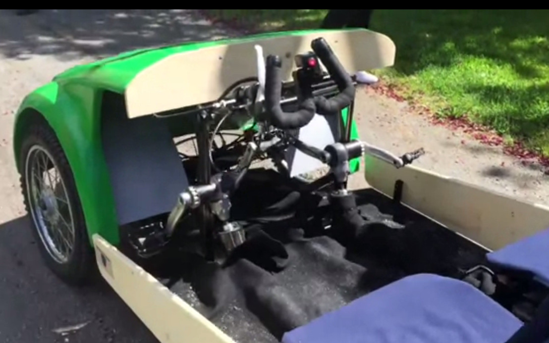 En muista tarkkaan, kuinka kalteva selkänoja on Twikessa, mutta sehän onkin rekisteröity autoksi polkimista huolimatta, ei tarvitse polkea lainkaan ja kulkee 80 km/h.