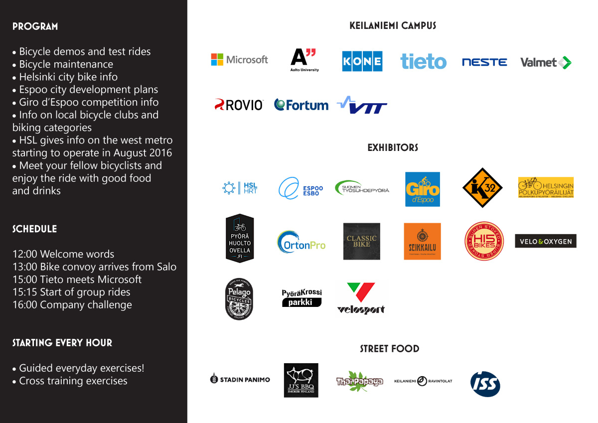 Olemme suunnittelemassa 10.5. 12-18 vapaaehtoisvoimin järjestettävää tapahtumaa Espoon Keilaniemessä, johon olisi tarkoitus kutsua Keilaniemen ja muun lähialueen yrityksistä väkeä tutustumaan pyöräilyyn, pyöräkerhoihin, eri pyöräilylajeihin ja Espoon pyöräkauppoihin. Ajankohta on kansallinen pyörällä töihin päivä.