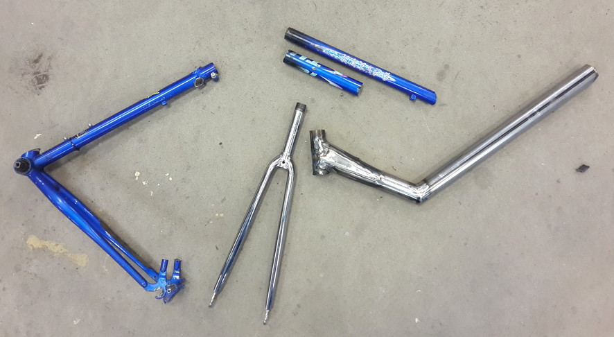 Tässä on Nojanallen tulevan pyörän etuosa jossa yläputki onkin kätsysti paikallaan. Toisin kuin itselläni joka hätäpäissäni otin lähimmän putkenpalan ja tein siitä koko stemmin – on tässä senverran ohkainen toi putki että sinne mennee normaali kiilapultti ohjainkannatin suoraan putken sisään (tieteskin kevein verio on hitsata siihen vain kiristysosa).
