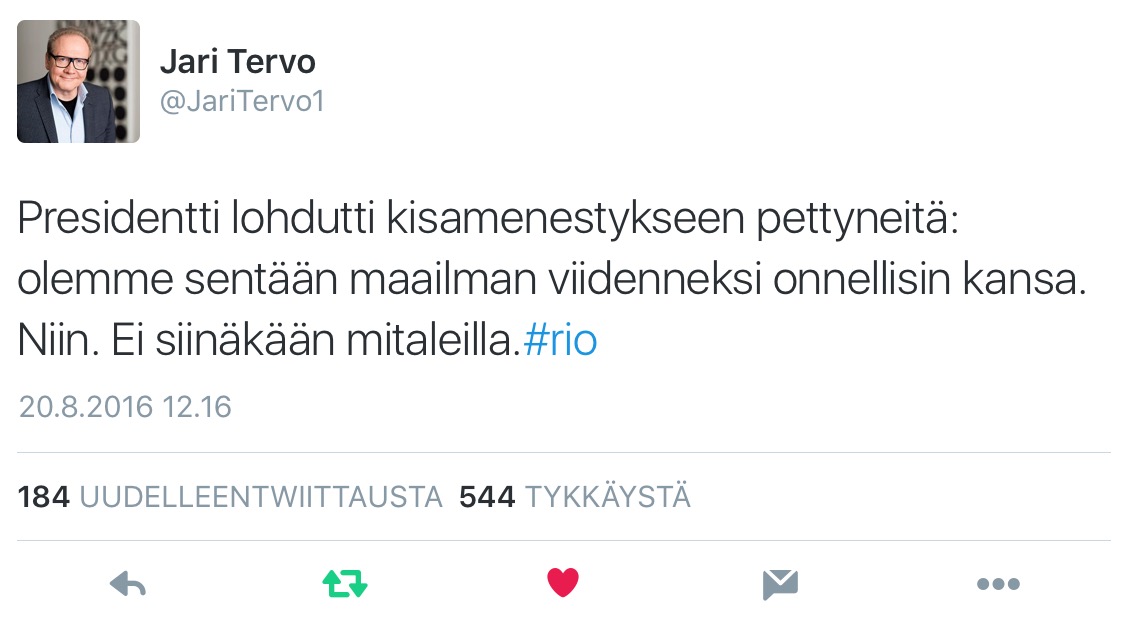 No, me nyt kuitenkin olemme tottuneet siihen, että vähintään mäkihypyssä ja keihäänheitossa ja rallissa ja aiemmin hiihdossa ja kestävyysjuoksussakin pärjäämme paljon nykyistä paremmin. Jokin on muuttunut muutamassa vuodessa. Emme ole enää edes onnellisuudessa mitaleilla. ![]()