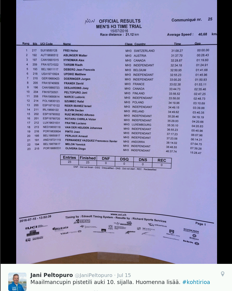 Jaa, ei tainut sanoo tuloksia aamu-uutisissa. Jani tais jäädä 6min. Nokialla käsipyöräilijä veivas tunnin aikana 23,7km - ehkä alle kahden tunnin nuo huiput sitten sen 60km ![]()