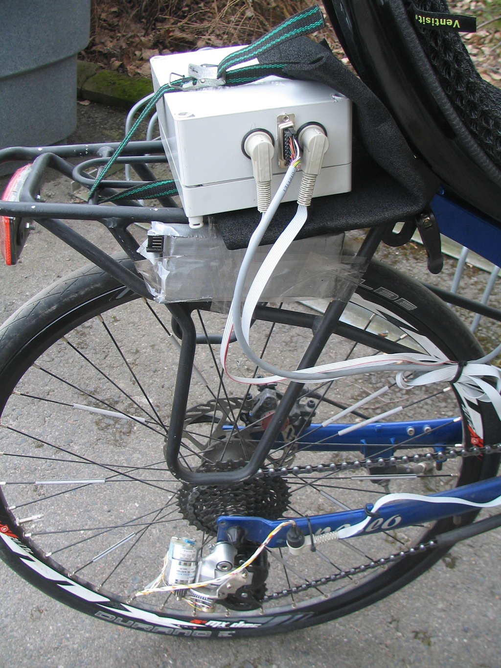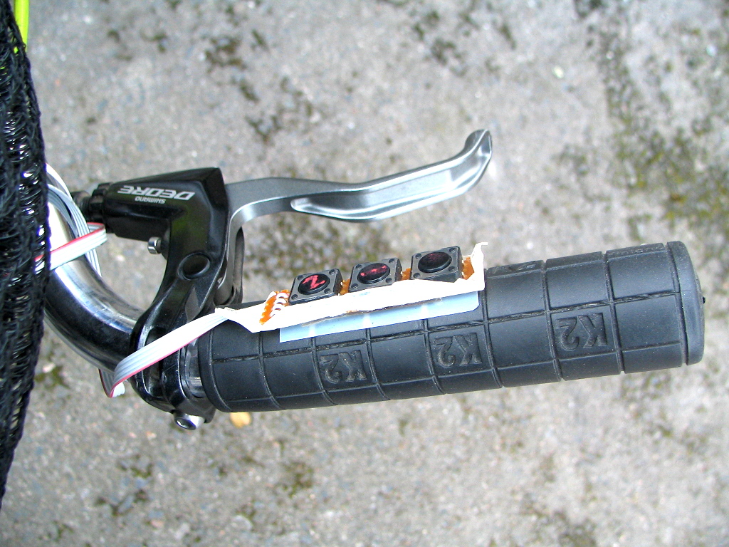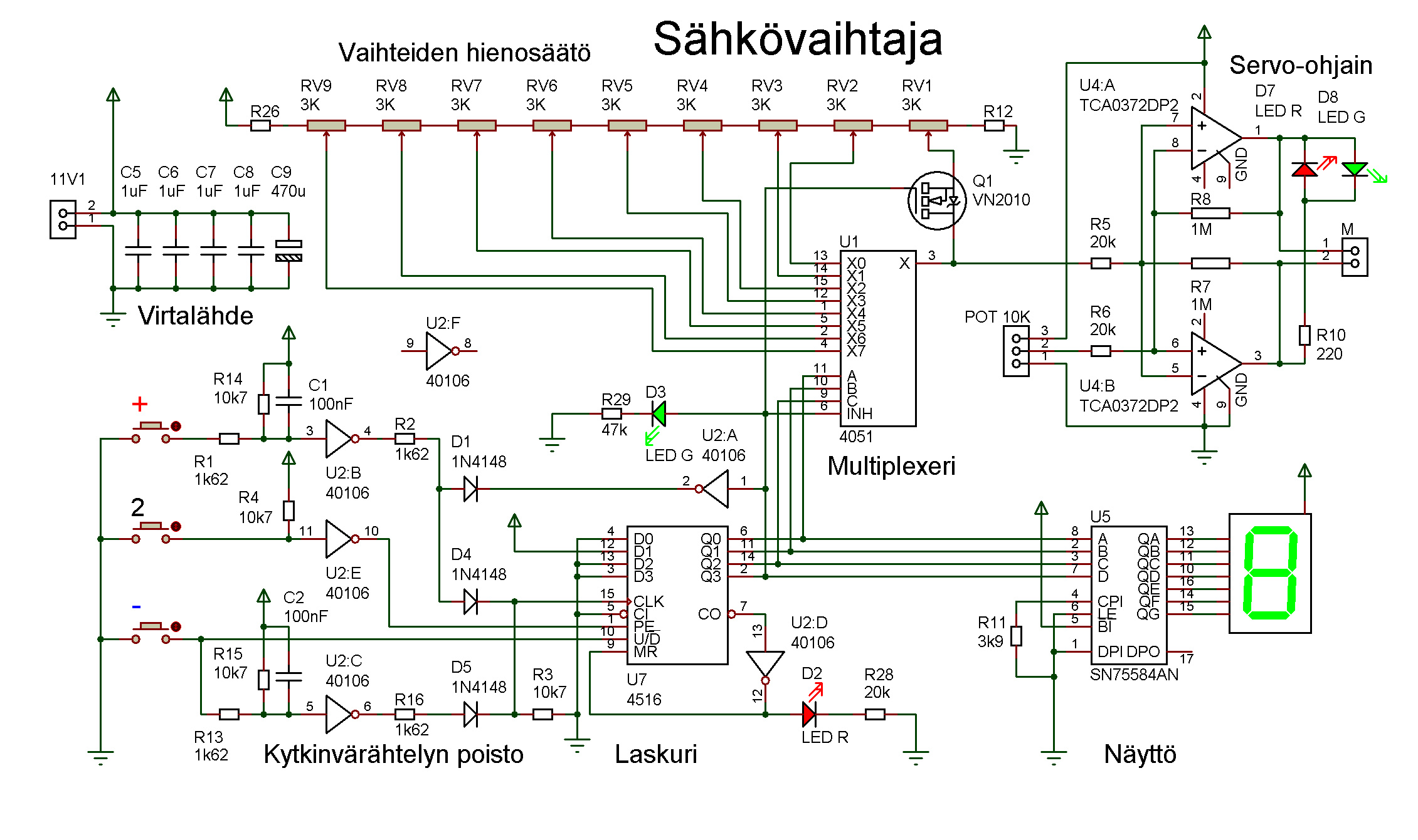 Tästä aion tehdä ihan piirilevyn kunhan olen kokeillut ohjainta jonkun 100km. Sitä ohjataan painonapeilla +, - ja 3. vaihde. Tuo 3. sen takia, että saa nopeasti pienemmän vaihteen valmiiksi kun pitää pysähtyä. Siihen saa asetettua myös jonkun muun vaihteen. Voisin laittaa piirilevyyn jumpperit tai DIP- kytkimet sitä varten. Tuo SN75584- näytönohjain on kätevä, yhdellä vastuksella voi säätää näytön kirkkautta. Siihen saa helposti vaikka LDR- vastuksen. Tuota kytkentää olisi vielä mahdollisuus yksinkertaistaa jättämällä painonapit ja laskuri pois ja niiden tilalle peukalokytkin. Pitää ottaa tuo huomioon layouttia suunnitellessa..