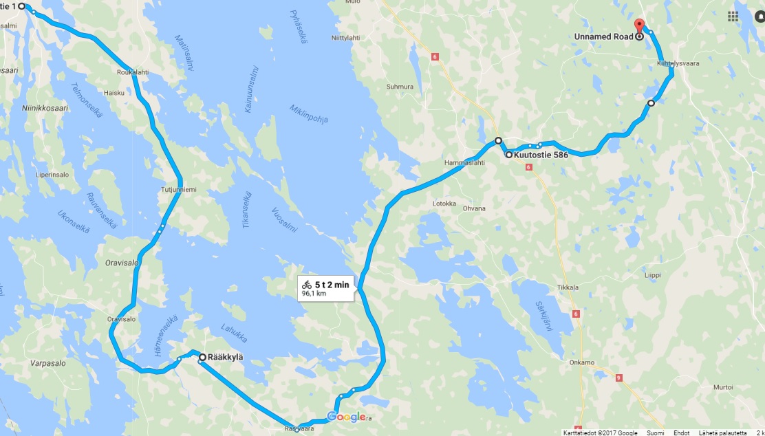 Ruokaa oli ainakin riittävästi ja vatsa turvoksissa sotkimme Uimaharjulle isompaa valtatietä. Mäet oli loivempia mutta asfaltti kehnoa kylätielaatua ilman piennarta (paitsi vikat 3km), rekkoja tarpeeksi mutta osasivat ohittamisen.
