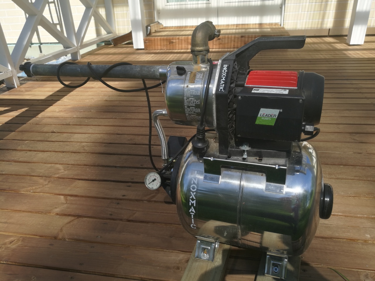 Tämä pumppu on asiakkaan käytössä, järvestä pumpataan kasteluvettä puutarhaan. Varmaan toistakymmentä vuotta vanha, viime kesänä olin huomaavinani, ettei vesi tuu enää riittävällä paineella. Jos ymmärrän oikein, alimmaisessa säiliössä on kalvo, jonka toiselle puolelle voi pumpata ilmaa (venttiili) ja vesi on toisella puolella. Paranisko paineet sillä, ett säiliöön pumppaan lisää ilmaa? Vai onko joku muu todennäköisempi syy?