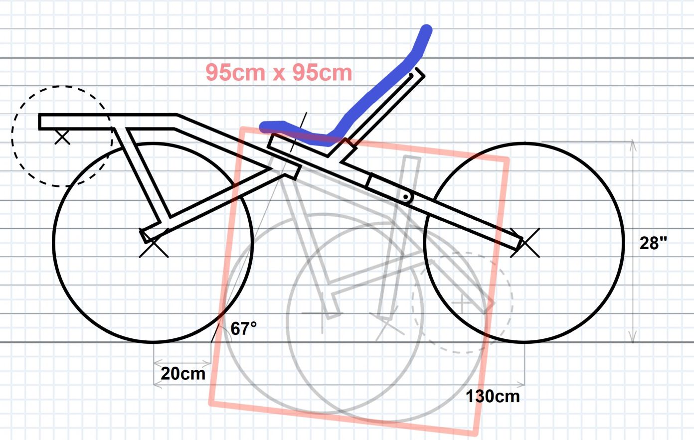 Pyörä taittuu kääntämällä eturengas ohjausnivelen ympäri taakse ja takarengas jousitusnivelensä kautta alaspäin, idea täältä. Penkki ja selkänojan tukipalkki olisi irroitettavissa pikalukituksella, hieman kuin kuntosalipenkin säätö. Kokoa saa edelleen pienennettyä renkaat irroittamalla. Rungon suunnitelmaa hienosäätämällä saa ehkä vielä muutamia senttejä pois. Kuvaan on merkattu punaisella laatikko, jonka sisään pyörä suunnilleen taittuu.