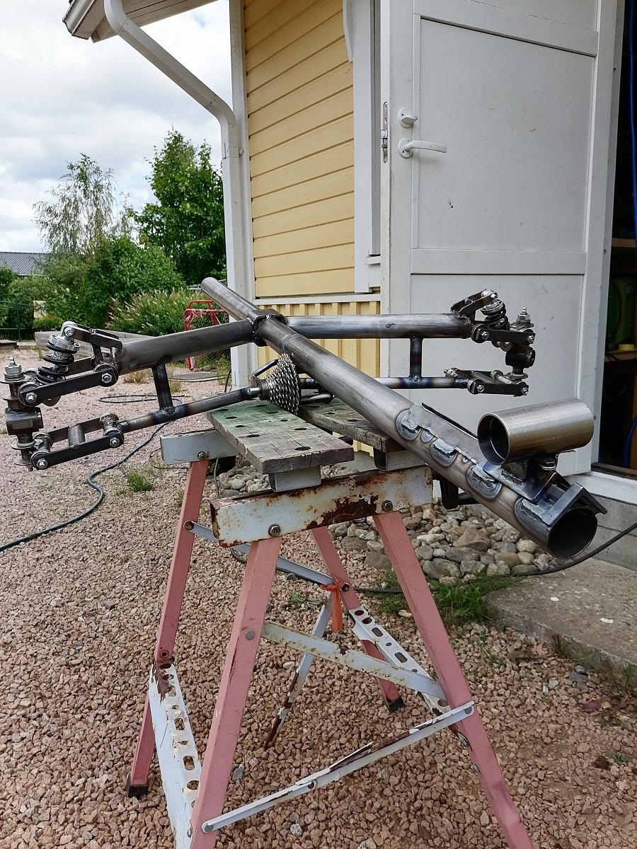 Projekti edennyt loman alettua vähän paremmin. Vähän arveluttaa kannattaako tästä tandemia tehdä, että suostuuko kukaan kyytiin kuitenkaan :lol: On tullut muutenkin tarpeeksi vaikeaksi taas tämä mutta pitäähän sitä haasteita olla. Seuraavaksi pitäis vetoniveliä alkaa sovittamaan, lisäksi tasauspyörästöstä pitäis tehdä kehitysversio. Ainakin rattaat sais olla vähän pienemmät ja sujuvammin rullaavat. Huono homma kun joutu tehdä runkoon kuopan että mahtui pyörimään. Ei vaan oo työmaalla oikein rattaiden tekoon työkaluja niin pitää soveltaa.
