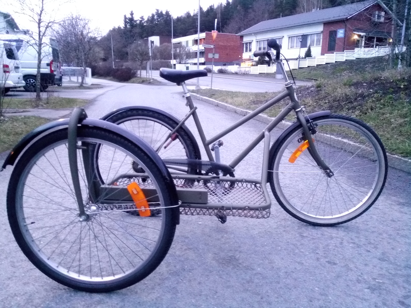 Sivuvaunun runko on vanhan ruohonleikkurin aisasta tehty. Pohjaksi joku verkko. Kiinnitys pyörään tulee joustavaksi, nyt on kudosvahvisteinen vesiletku. On liian löysä, vaihdan teräskudos hydrauliletkuksi, sen verran saa firma sponssata. ![]()