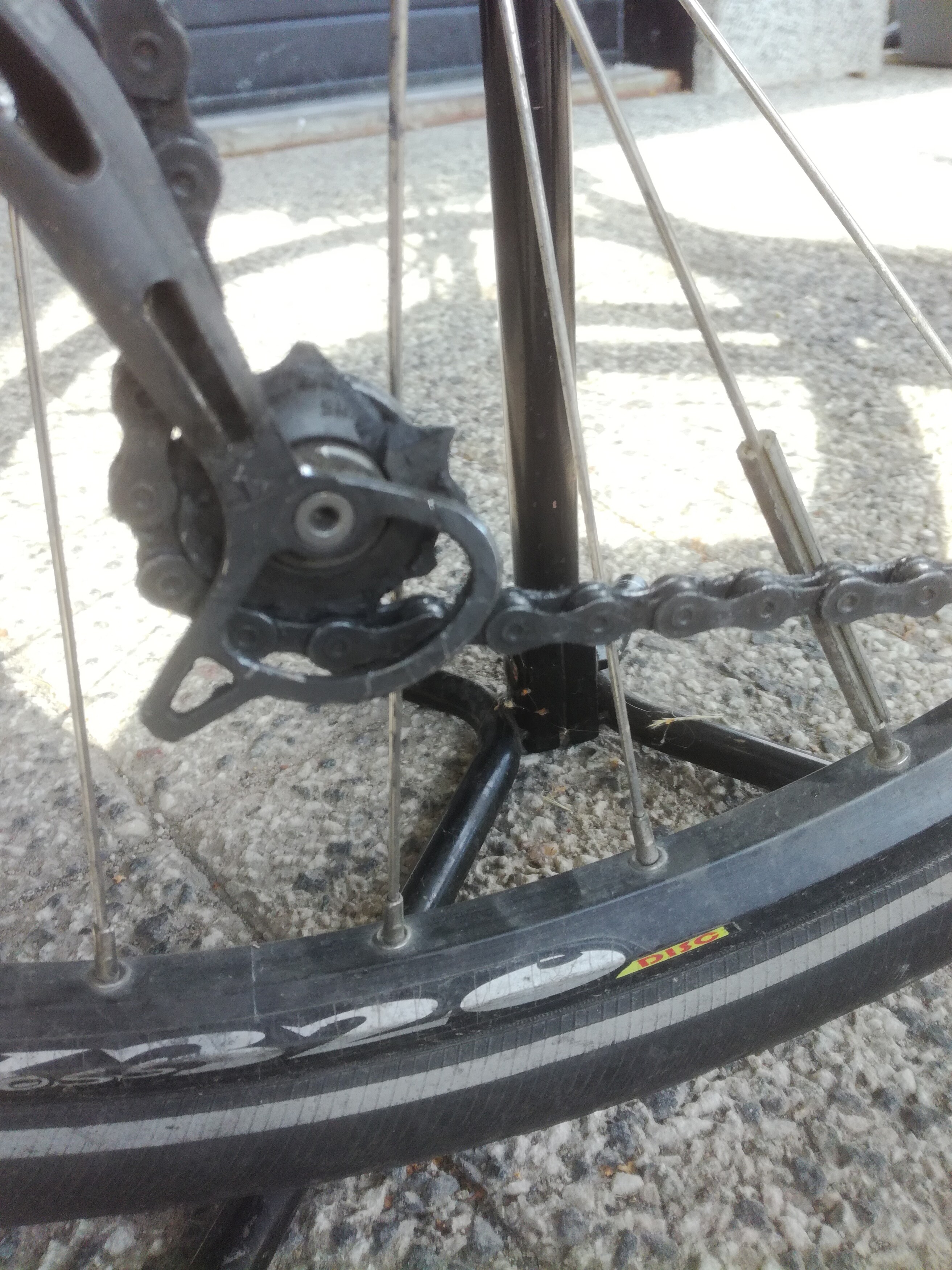 Vaihtajan kiinnityskorvakkeen tehtävä on olla riittävän pehmeä, jotta se taipuu ennen kuin takahaarukalle aiheutuu pysyviä muodonmuutoksia. Siten korvakkeen voi myös oikaista paikoillaan. Jos se korvake siis on jo vääntynyt, voi sitä ainakin yrittää oikaista. Eipä tuossa mitään menetä, jollei onnistu.