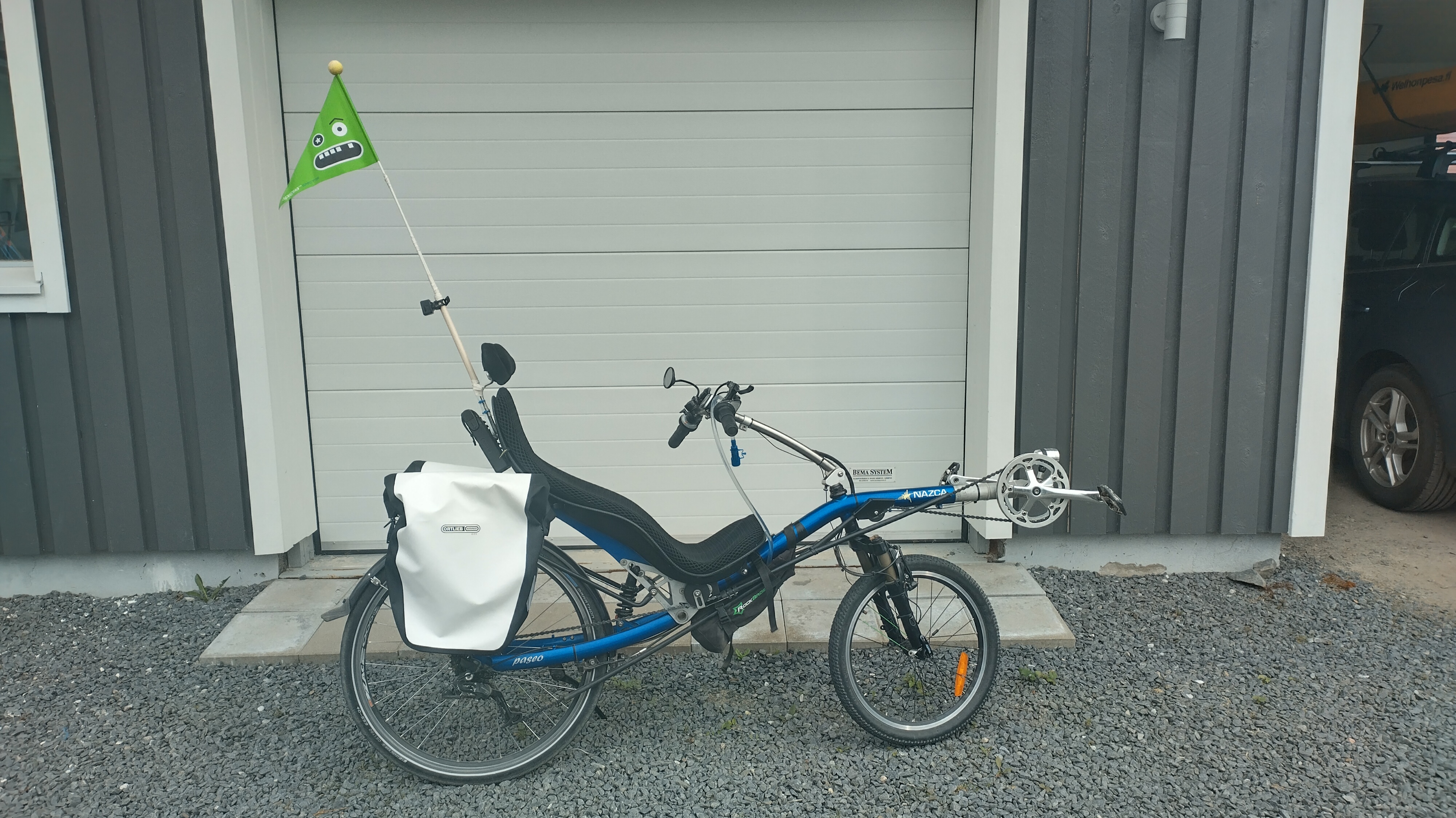 Tänään värkkäilin aamupuhteena Paseoon vähän laukkuja kiinni ja väkersin nurkkiin pyörimään jääneestä lasten pyörän turvaviiristä vähän lyhyemmän huomiolipun, jonka kiinnitykseen mallailin paikan myös bontragerin takavalolle.