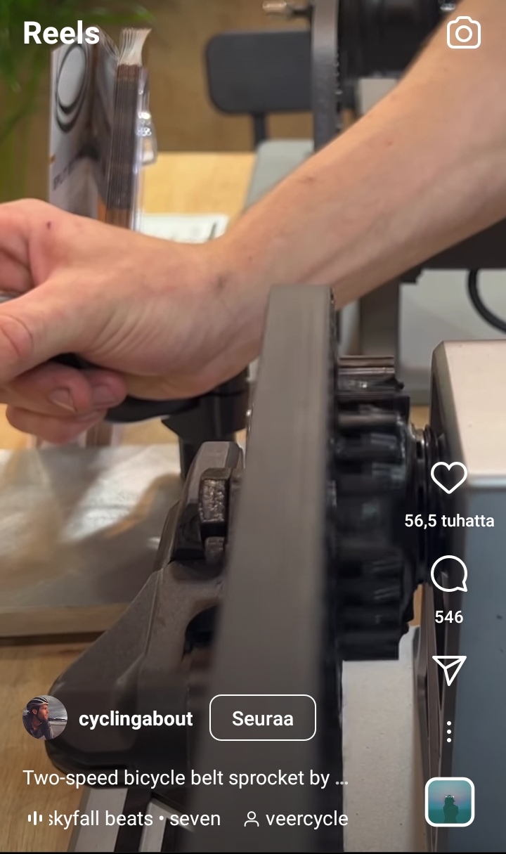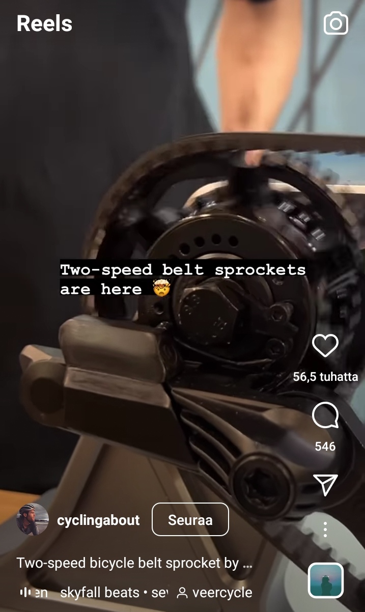 En tiedä instagrammeista, enkä muutenkaan tästä tuotteesta, mutta tuollaista hihnaa ei saa toimimaan kuin linjassa, joten ainoa keino vaihtaa vaihdetta kahdella eri kokoisella hihnapyörällä on laittaa kaksi hihnapyörää samalle akselille rinnakkain myös hihnan toiseen päähän. Tällainen hihna on sivusuunnassa niin jäykkä, ettei pysy päällä, jos veto on vähänkin vino. Tätä ominaisuutta on sitten hyvä käyttää vaihtajan toiminnassa. Vaihtaja siis työntää hihnan ensin pois isommalta hihnapyörältä, sitten työntää hihnan toisen pään sen pään isommalle pyörälle, jolloin hihna kiristyy aloittaneen pään pienemmälle hihnapyörälle. Hiihna siis vain vaiheittain suuntaissiirtyy toiselle hihnapyöräparille. Kahta vaihdetta varten tarvitaan siis neljä hihnapyörää.