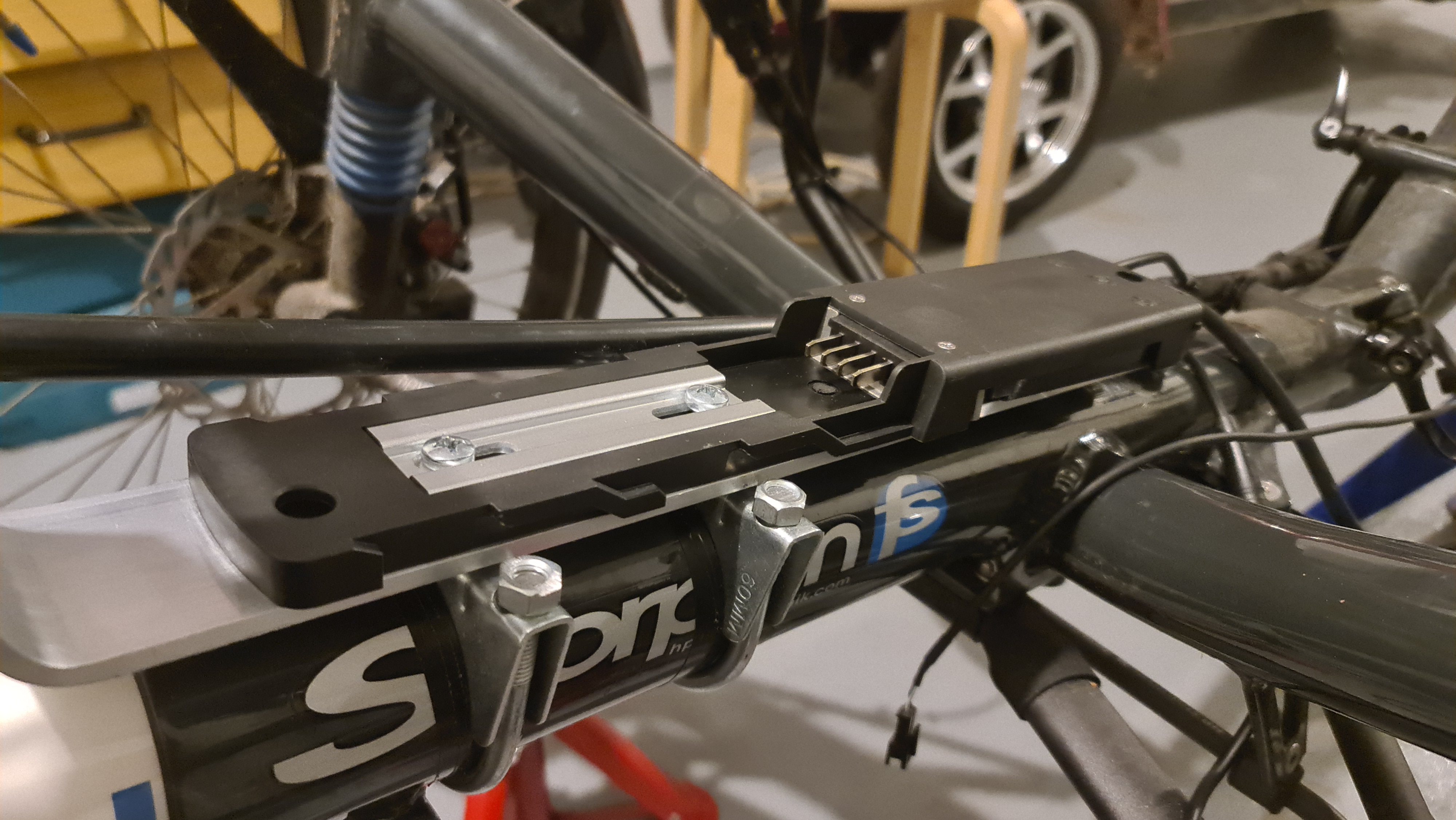 Grin on lopettanut suurimmalta osalta Hailong-akkujen toimittamisen, joten heiltä ei myöskään saa enää Baserunner_L10 kontrollerille työstettyjä alumiini koteloita Hailong-telakkaan. Tilasin Akkutehtaalta Hailong-telakan ja siinähän oli erilainen kotelo, joten katkaisin kotelon ja pulttasin telakan ja kontrollerin alumiinikiskoon, jonka taas kiinnitin pakoputkiklemmareilla runkoputkeen.
