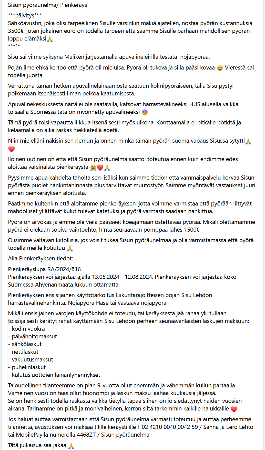 Toivottavasti Sisun pyörärahat saadaan nopeasti kasaan ja uusi nojapyöräilijä joukkoomme