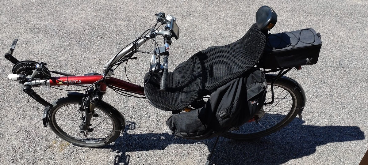 Testipakkauset (ja oikeatkin) ja koeajot tehty. Jarrut säädetty vähän paremmin toimivaksi. Näköjään taidan selvitä ilman sivulaukkuja, sillä nuo S-kokoiset banaanilaukut on varsin tilavat. Illan viileydessä lisäsin ohjauspuomiin juomapullotelineen, joka ei näy kuvassa.
