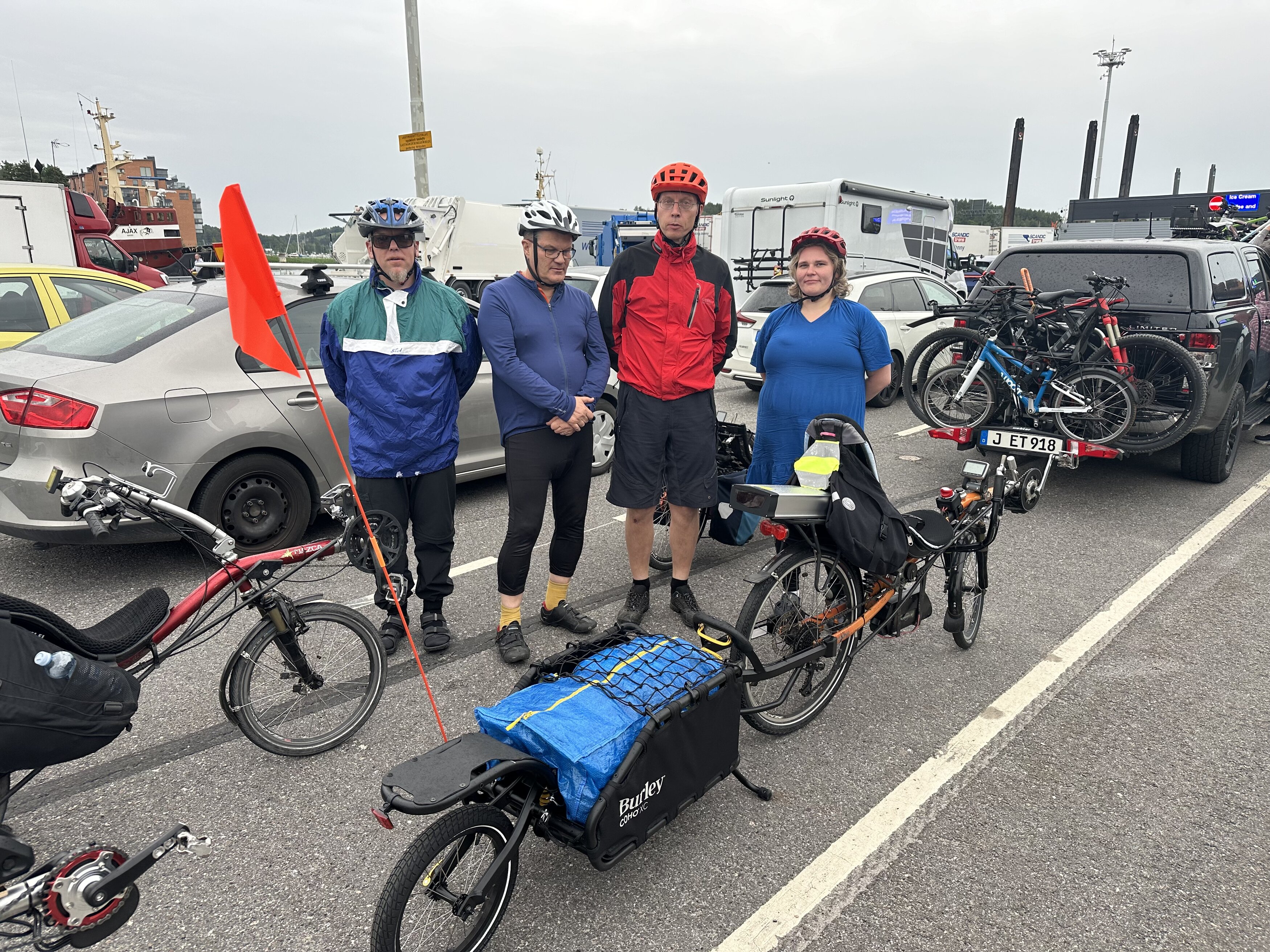 Ottakaa aamulla vielä täydennykseksi kalustokuva, jossa näkyy kaikkien pyörät ja pakkausjärjestely. Pekalla näyttäisi olevan ihan kunnolla tavaraa mukana. Tepon ja Annin pyörät jäivät kuvaajan skoopin ulkopuolelle, kun ei ollut perinnettä. ![]()