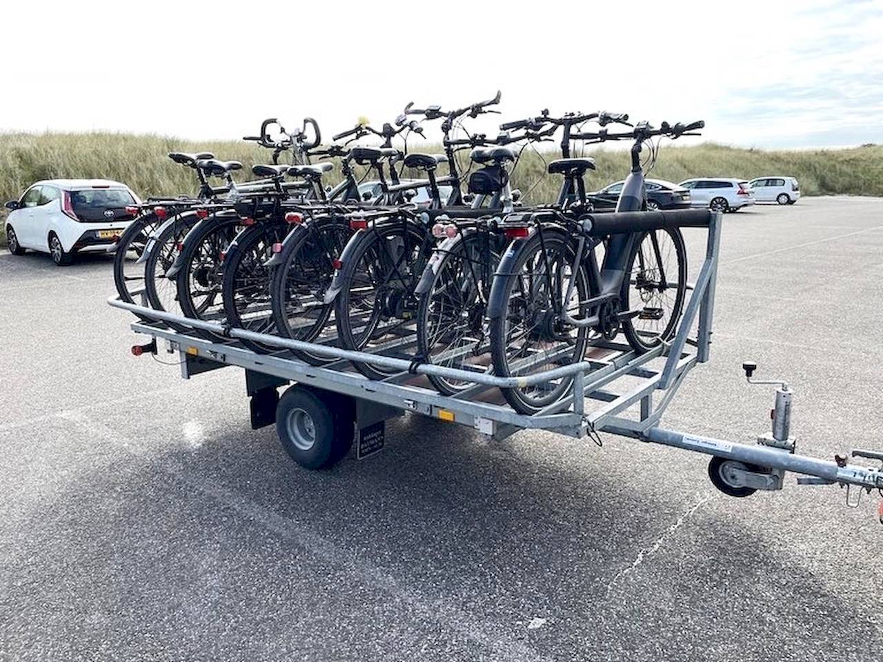 Kuvassa on jarrullinen kärry, mutta pyöräpaikkoja on ainakin 24 ja lisänä vielä matkavarustekaappi. Jarrullisen kärryn tarpeesta, en olisi huolissani vielä alle kymmenen pyörän kuormilla.