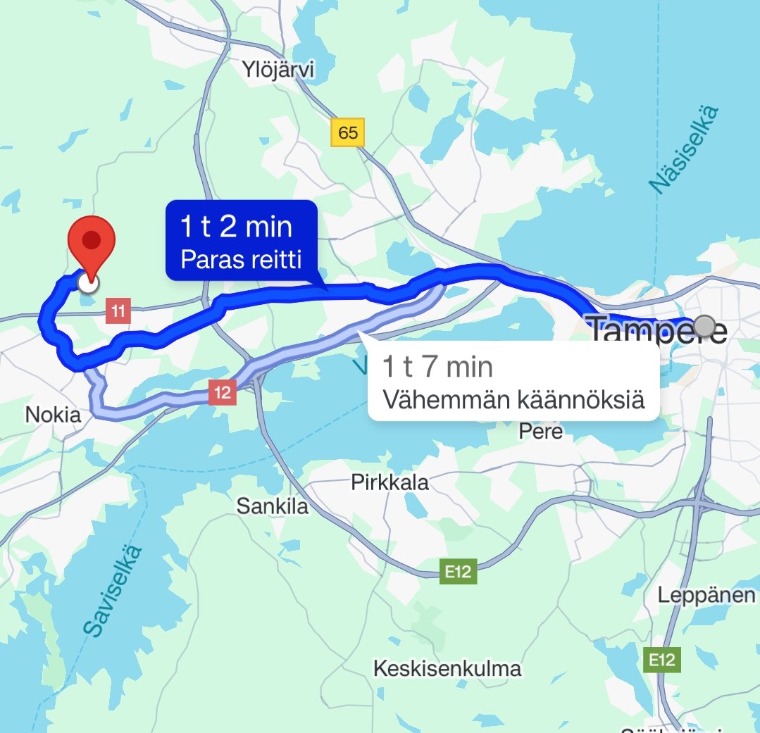 Tampereen rautatieasemalta polkaisin Flevolla Nokian kisapaikalle 18km. Kotona katsoin reitin, eikä ollut ajaessa navigointia. Onko tuo liian helppo esimerkki?
