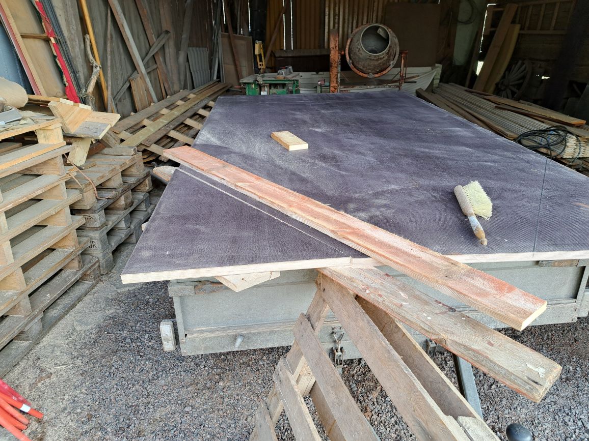 Vaimon hevoskopin vanerit olivat pehmenneet ja täytyy vaihtaa. Homma on odotellut uusia levyjä, tyypilliset varastomittaiset ei ole tarpeeksi suuria. Tuttu kauppias sitten jostain löysi sopivat. Pohjaan tulisi vanerin päälle alumiini turkkilevyt. Pelkästään pohjalevyn purkamisessa oli tolkuton homma, yksin noita ei nosta mihinkään. Kopin päällä olevaa lasikuituista kuomua pitäisi saada nostettua jotta seinälevyt pystyy vaihtamaan.