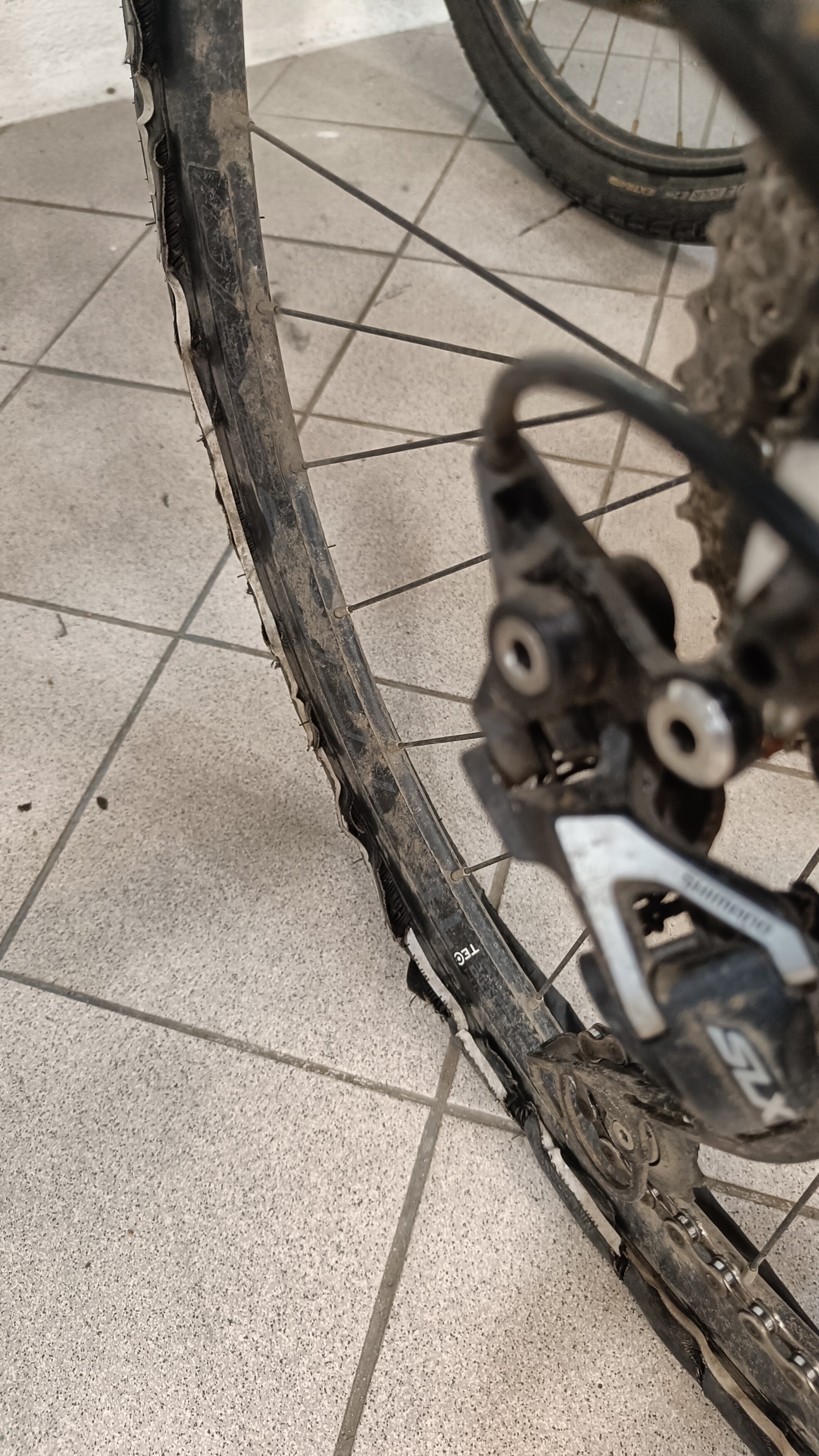 Joku oli yrittänyt vielä asentaa tähän ulkorenkaaseen uuden sisäkumin joka räjähti pumparessa.